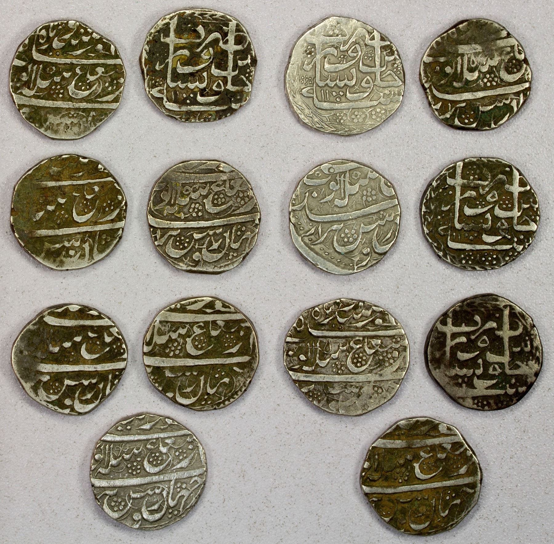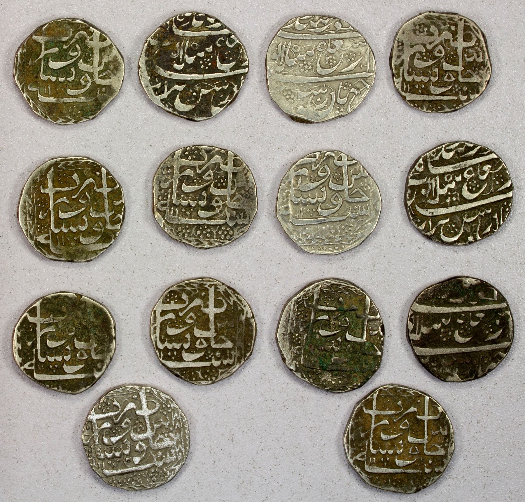 DURRANI: Ayyub Shah, 1817-1829, LOT of 14 silver rupees, type A-3135 (KM-733), Peshawar mint, with regnal year 11 and without Hijri date, believed struck for about three years under Sikh control, mostly VF, a few only Fine; retail value $400, lot of 14 pieces.