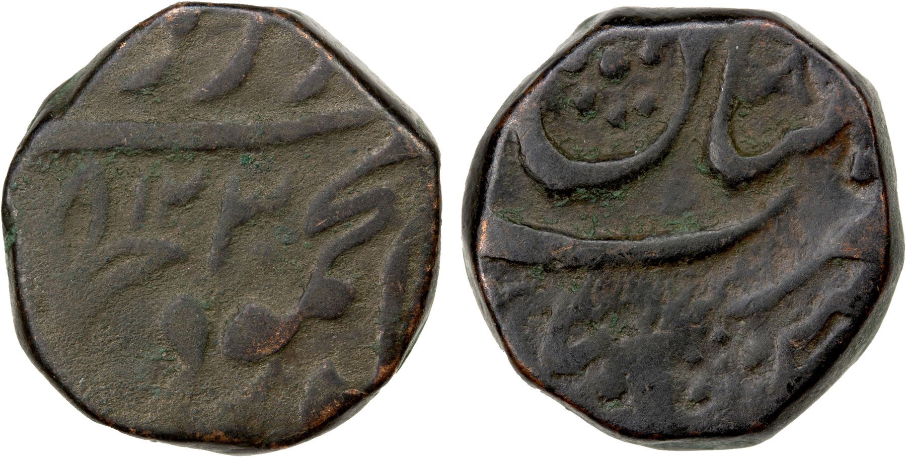 DURRANI: Mahmud Shah, 1809-1817, AE falus (12.18g), Multan, AH1230 year 7, A-3133, KM-677, flower on obverse, left of the date, VF, R. Copper fulus of Multan are Durrani until AH1232. Multan was taken by the Sikh in mid-1233 and began striking copper fulus in 1235, always in the name of Mahmud Shah.