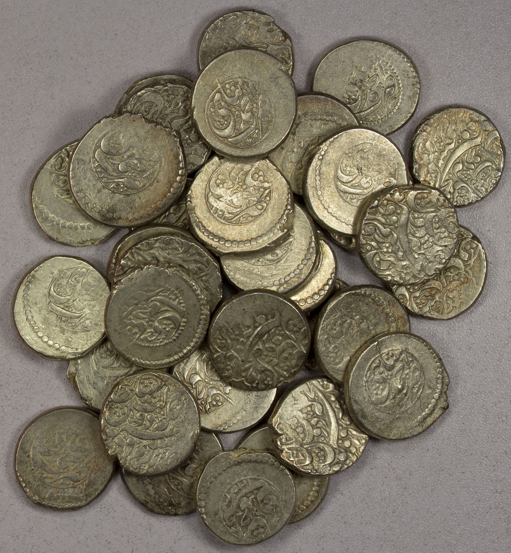 DURRANI: Mahmud Shah, 2nd reign, 1809-1817, LOT of 34 silver rupees, type A-3131.2 (reduced weight), KM-158.2 with simple reverse design, Ahmadshahi mint, 14 dated AH1232 and 20 dated 1233; virtually all VF condition, but most with at least some weakness of strike; retail value $950, lot of 34 pieces.