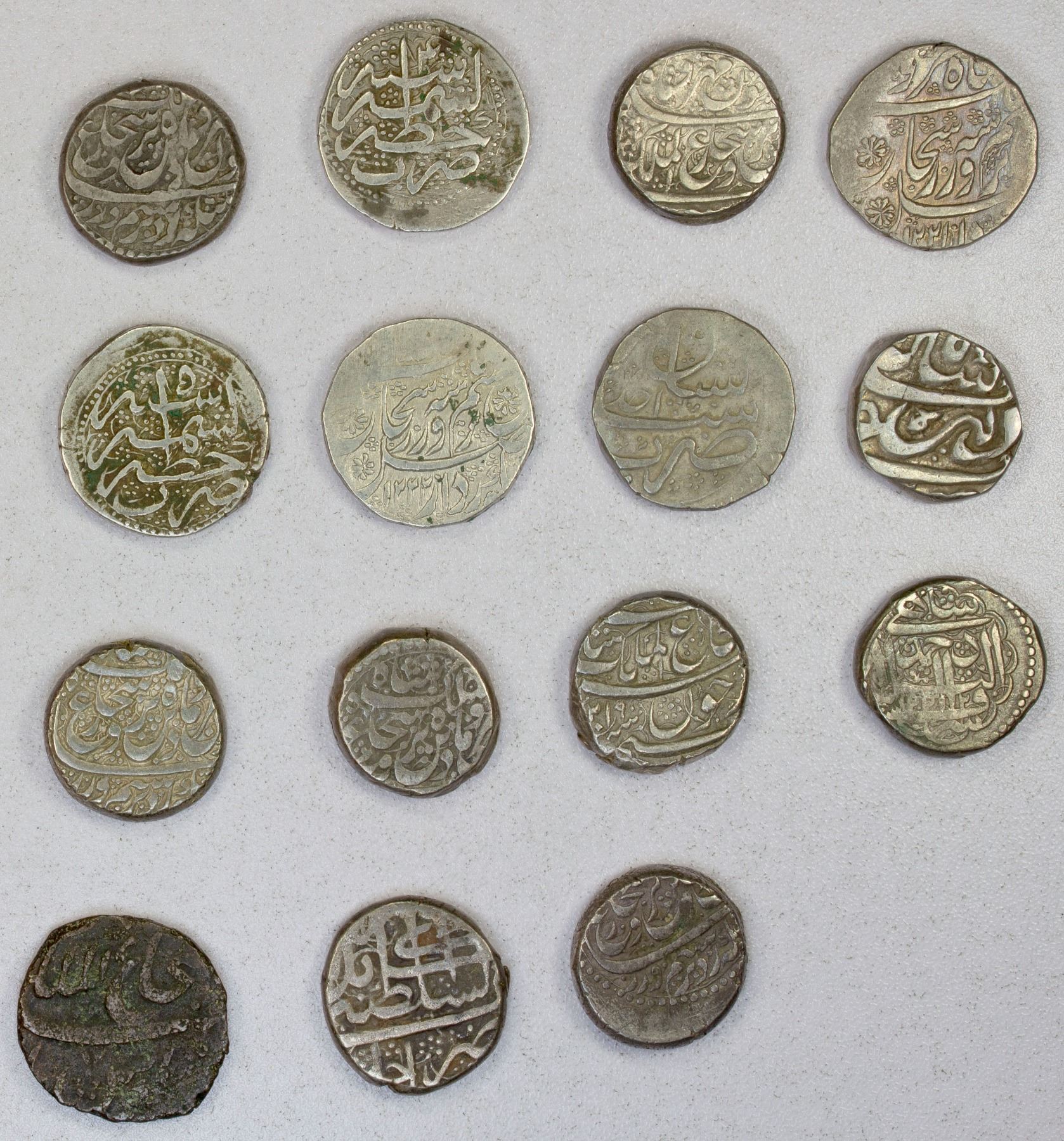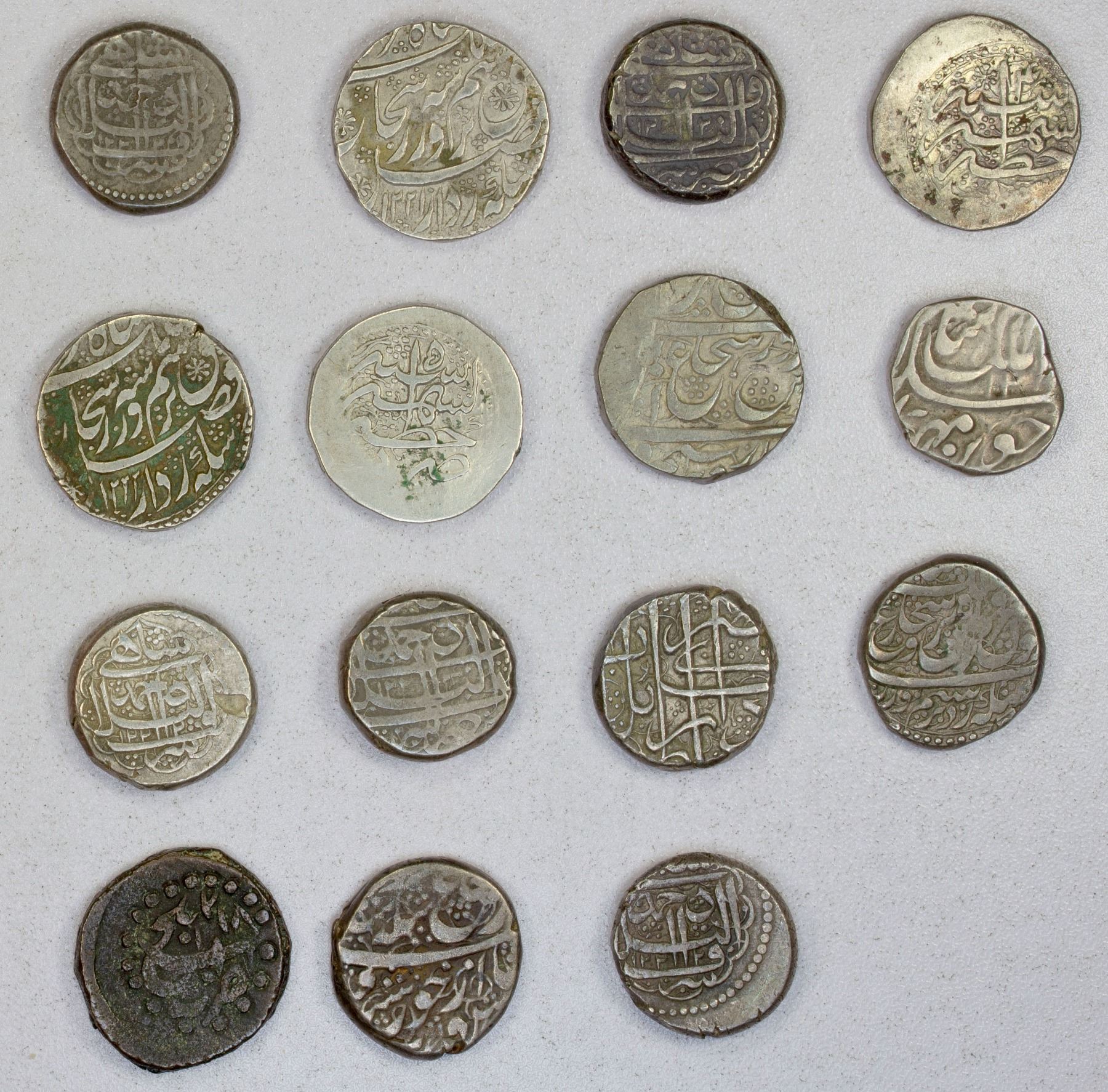 DURRANI: Shah Shuja', 2nd reign, 1803-1809, LOT of 14 silver rupees & one copper falus, Silver: Ahmadshahi (6 pcs, including years AH1220, 1221, 1222, and 1223), Derajat (1, year 5), Kashmir (4, two each of 1221/4 and 1222/5), Kabul (2. one 1219, the other year 1), and Peshawar (1, year 1); mostly VF,some with some minor weakness towards the edge; and Copper: Balkh (1, 1218, VF but porous surfaces); retail value $400, lot of 15 pieces.