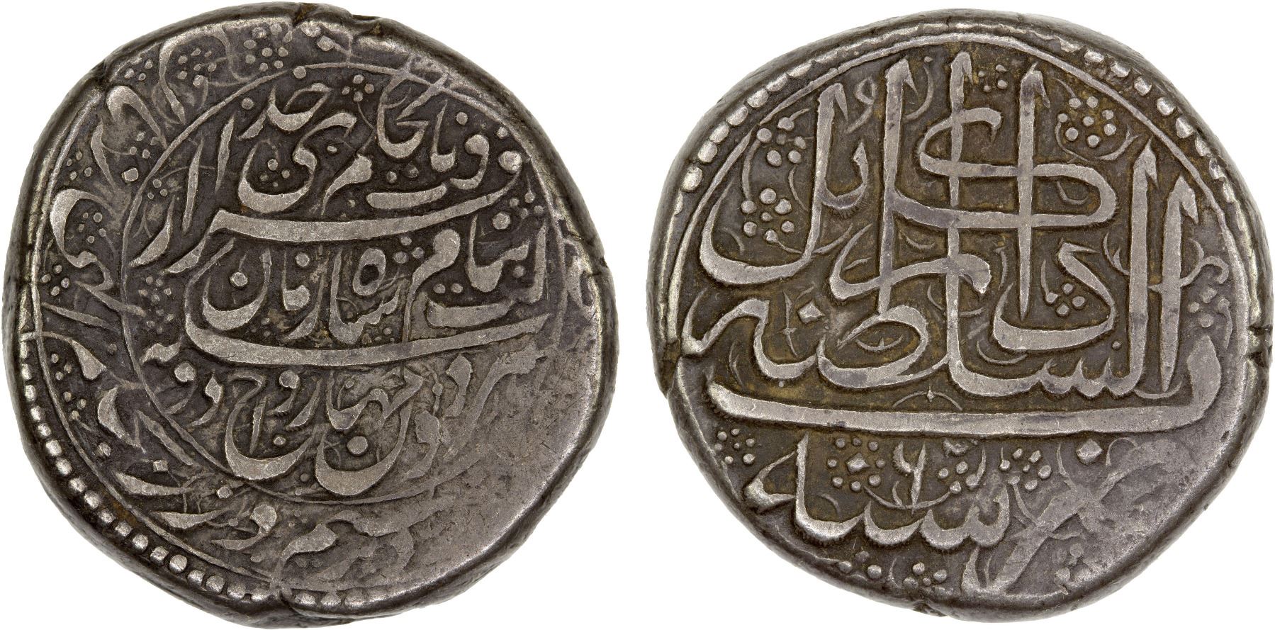 DURRANI: Shah Zaman, 1793-1801, AR double rupee (23.02g), Kabul, AH(1212) year 6, A-3107, KM-444, struck on the usual broad thick planchet for this type; decent strike without only one spot of weakness near the edge, strong VF, RR. The Hijri date is confirmed by the example sold in our Auction 15, lot 740, same dies with clear Hijri date 1212.