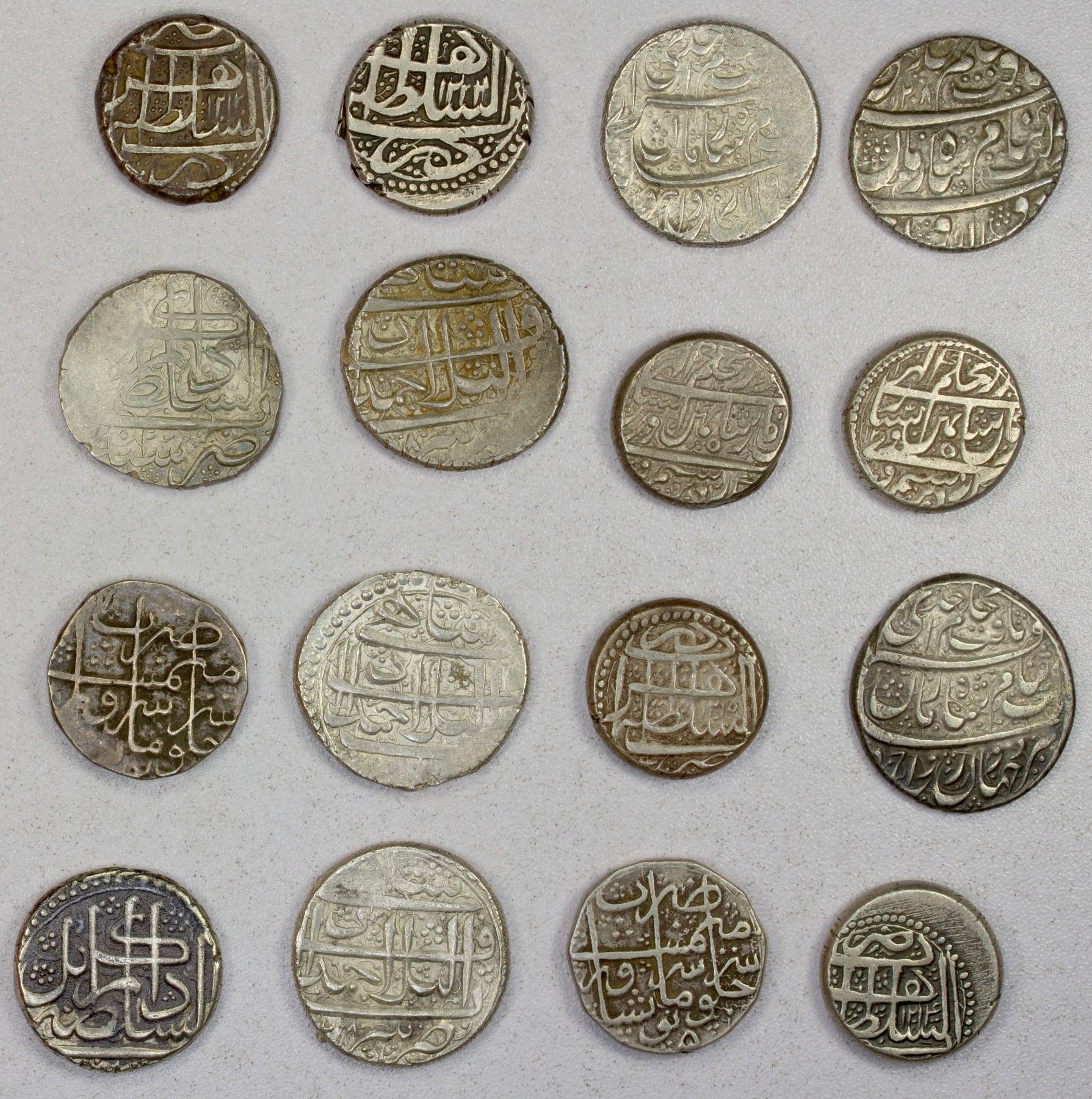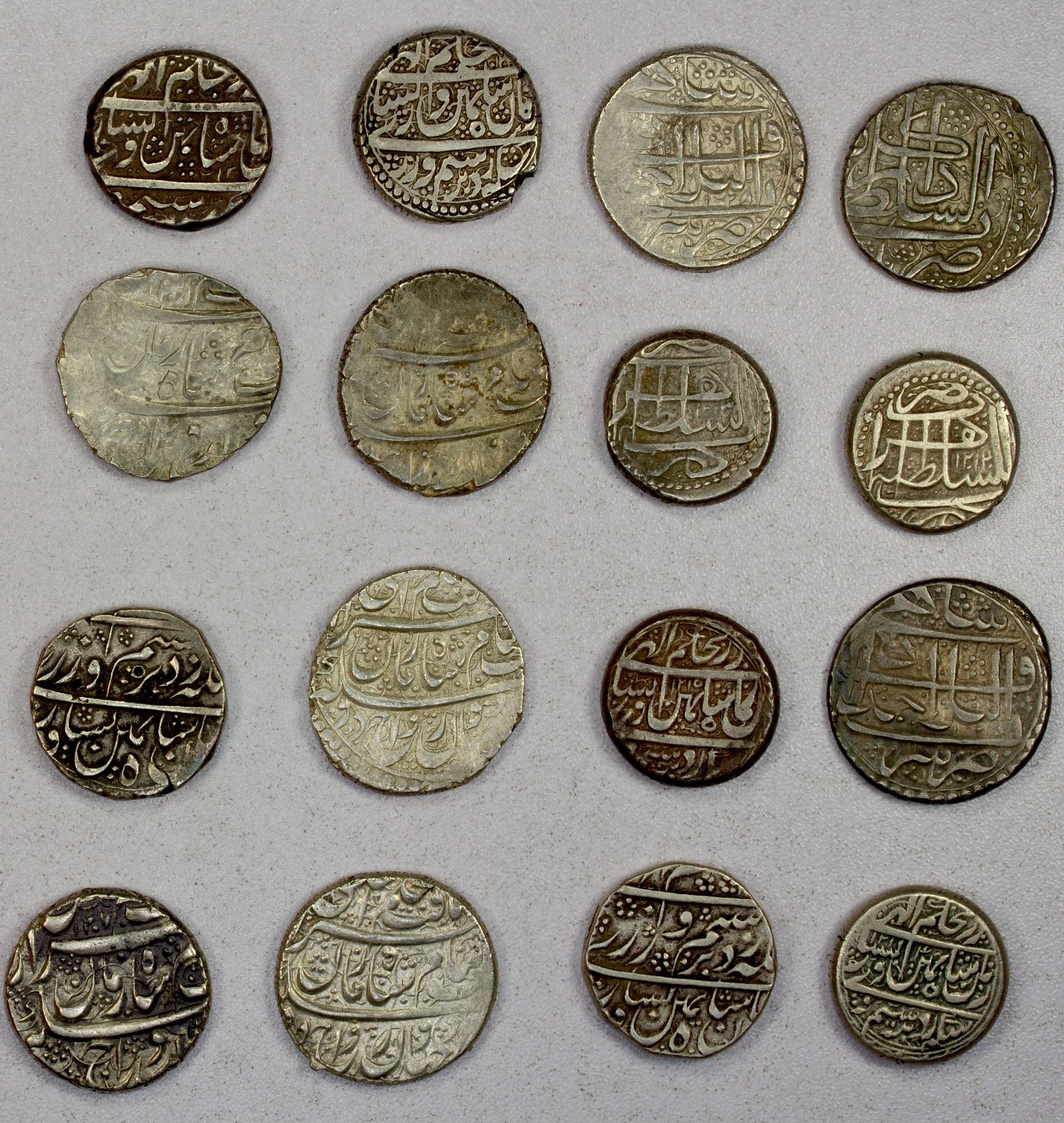 DURRANI: Shah Zaman, 1793-1801, LOT of 16 silver rupees, type A-3108: mints: Ahmadshahi (5 pcs, most dated AH1208), Herat (7, including all dated 1212-1215), Kabul (3, dates 1207 and 1208), and Peshawar (2, one dated year 5, the other date off), nearly all VF condition, just two with some weakness; retail value $550, lot of 16 pieces.
