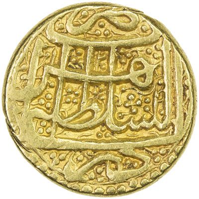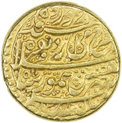 DURRANI: Taimur Shah, 1772-1793, AV mohur (10.85g), Herat, AH1208//1201, A-3099, KM-386, posthumous issue, obverse date at the bottom, final digit of the reverse date above the S of al-sultana, bold dates on both sides, choice VF, R. Same dies as lot 601. The reverse date is likely an error for AH1210, muled with the normal obverse die of 1208.