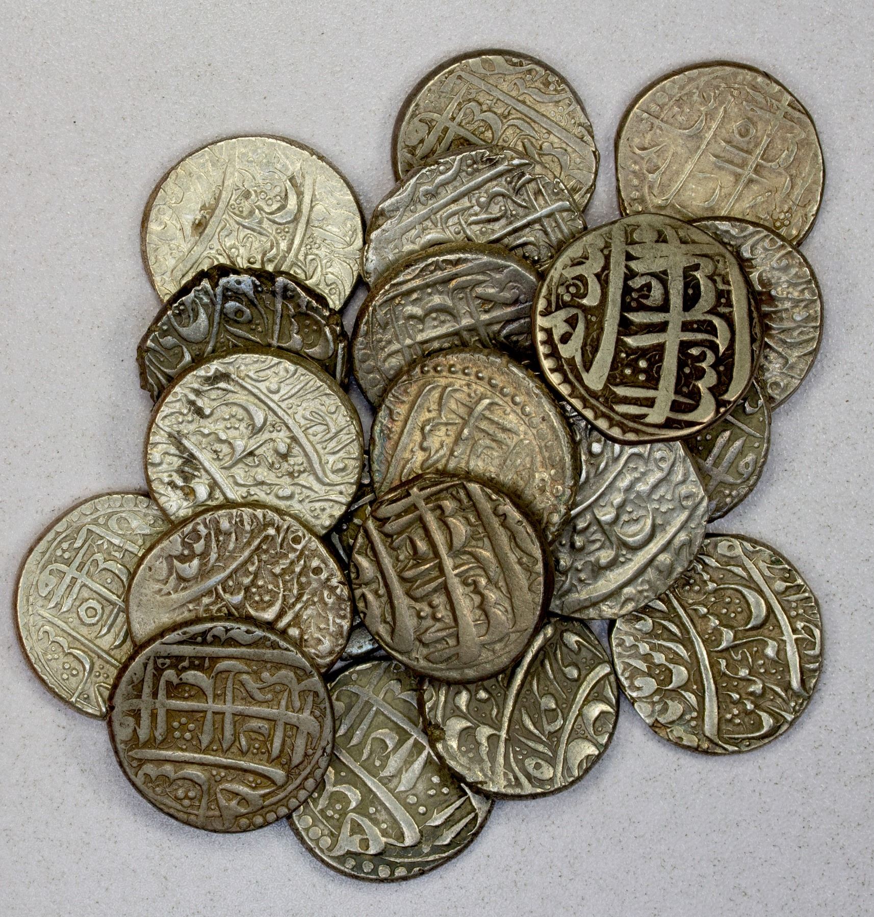 DURRANI: Taimur Shah, 1772-1793, LOT of 21 silver rupees, type A-3100, Ahmadshahi mint (= Qamdahar), including AH1204 (2 pcs), 1205 year 19 (8), 1206 year 20 (4), 1207 year 12 (3, error for year 21), and date off (4), nearly all VF condition; retail value $700, lot of 21 pieces.