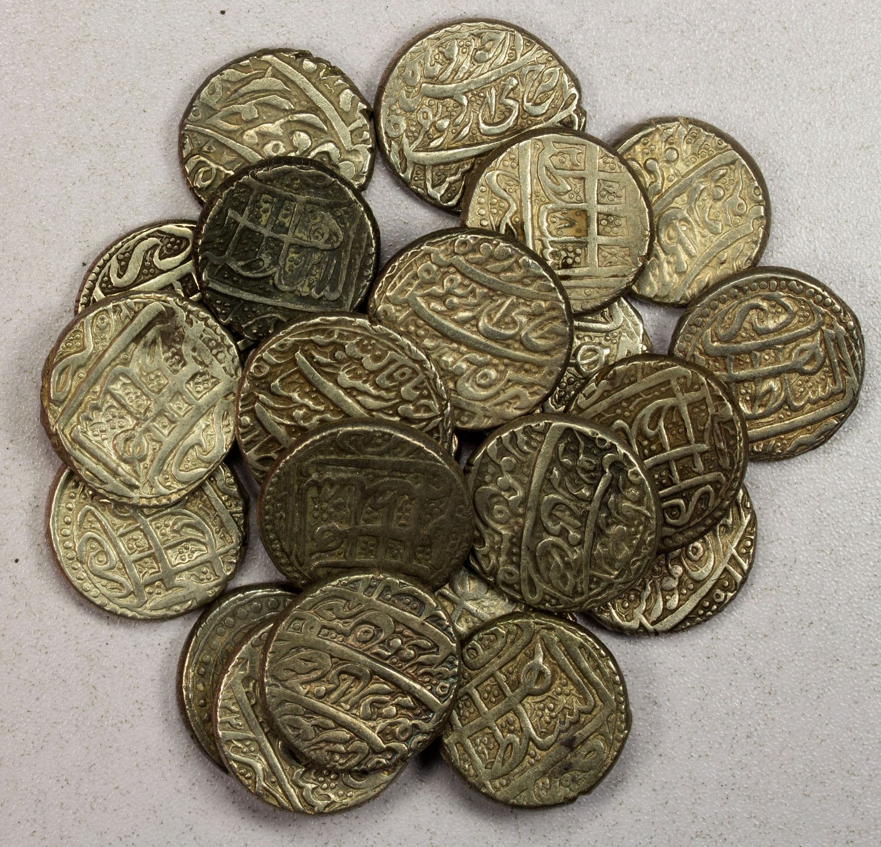 DURRANI: Taimur Shah, 1772-1793, LOT of 22 silver rupees, type A-3100, Herat mint, dates AH1189 (3 pcs), 1204 (1), 1205 (4), 1206 (4), 1207 (2), and posthumous years 1208 (3) and 1211 (1); almost well-struck VF condition and all without any damage; retail value $750, lot of 22 pieces.