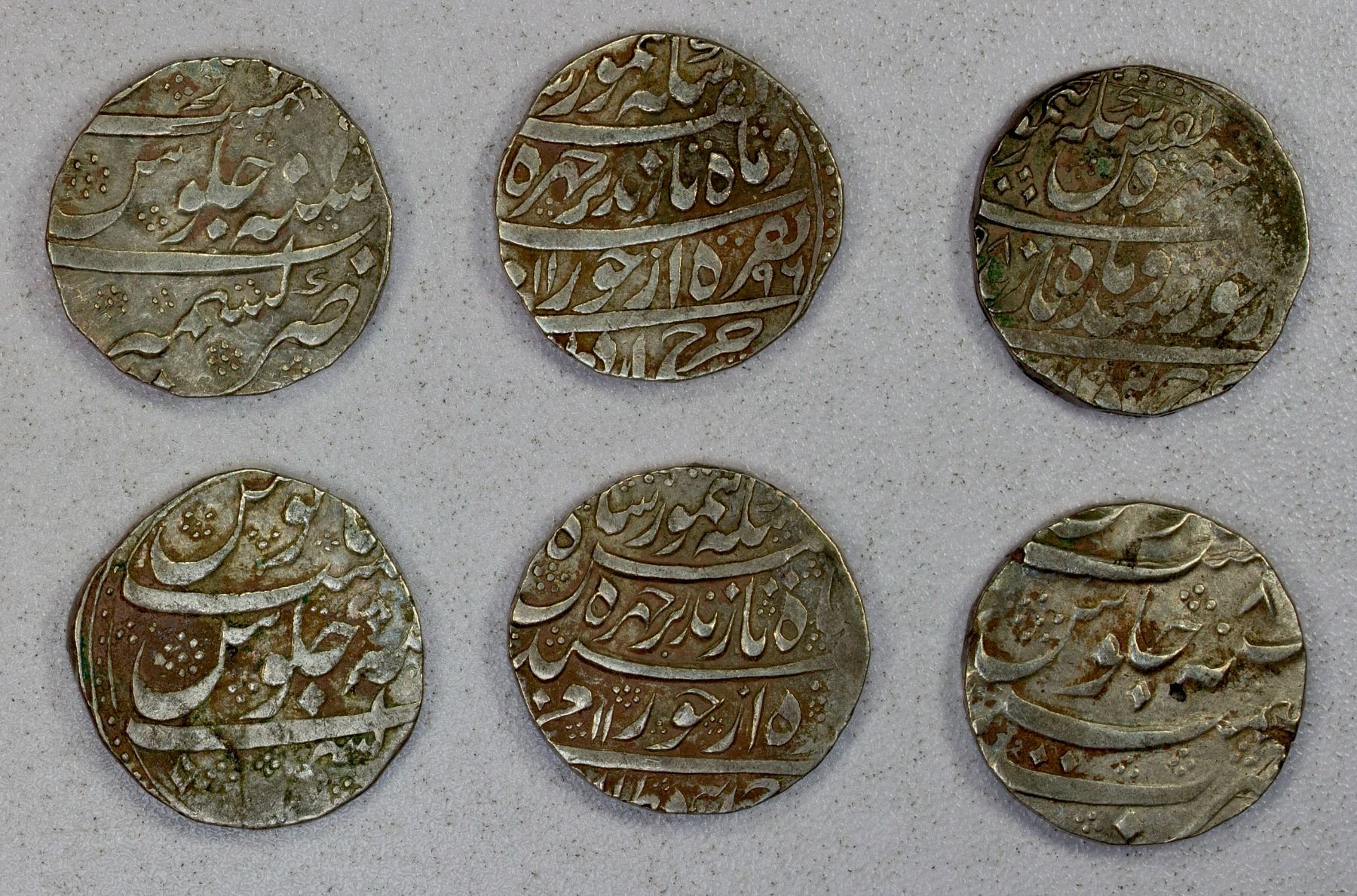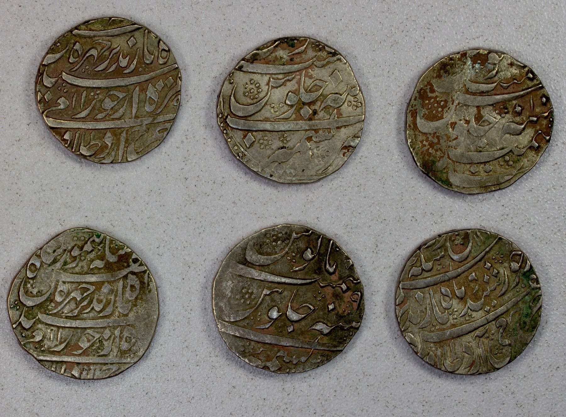 DURRANI: Taimur Shah, 1772-1793, LOT of 6 silver rupees, type A-3100, Kashmir mint, including year 8, AH1196, year 9, 1198/10, year 10, and mint/date off; nearly all VF condition, struck to the lighter weight of the Kashmir mint (average 10.98g); retail value $240, lot of 6 pieces.