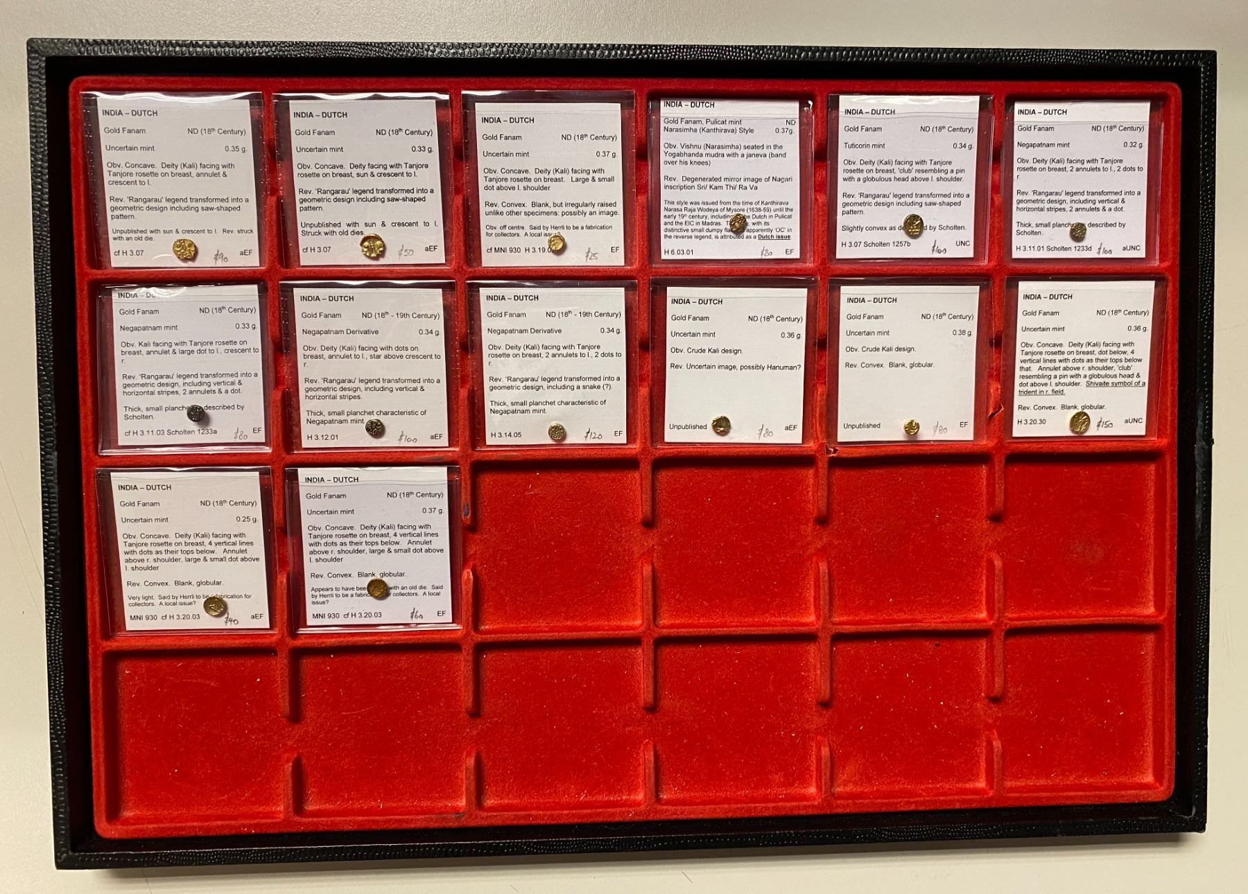 DUTCH INDIA: LOT of 14 gold fanams, Excellent collection of the various fanams issued in the Dutch possetions, catalogued by the consignor by the Herrli (H) numbers, with Ian Todd's full descriptions: Pulicot: (1) H-6.03.01; Tuticorin: (1), H-3.07, Sch-1257b; Negapatnam: (4) H-3.11.01, 3.11.03, 3.12.01, and 3.14.05; and Uncertain mint: (8) H-3.07 (two pieces), 3.19.07, 3.20.03 (two), 3.20.30, uncertain attribution (two); average weight about 0.36g; all in EF or better condition; excellent representation of this complex series and all with Ian Todd's description; retail value $850, lot of 14 pieces.