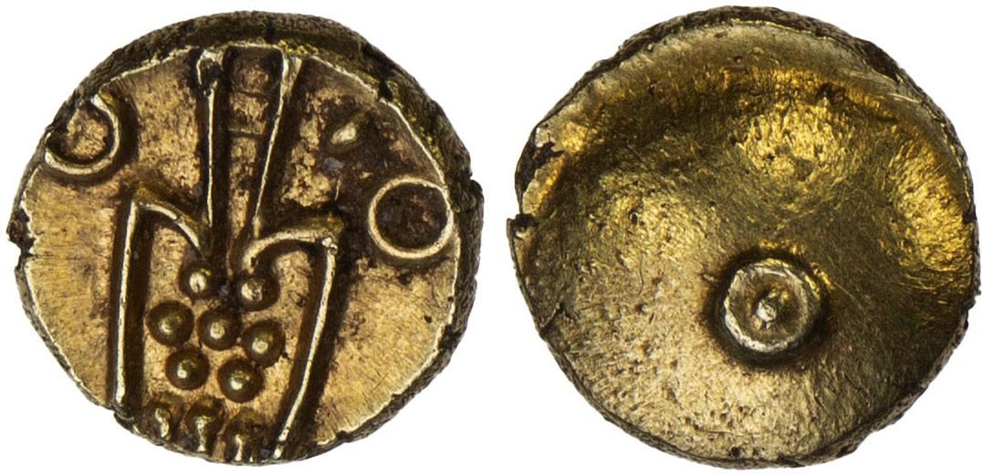DUTCH INDIA: TUTICORIN: Anonymous, AV fanam (0.31g), ca. 1742-1794, Sc-1257var, stylized figure of goddess Kali, annulet to each side // pellet-in-circle, rare variety, XF-AU.