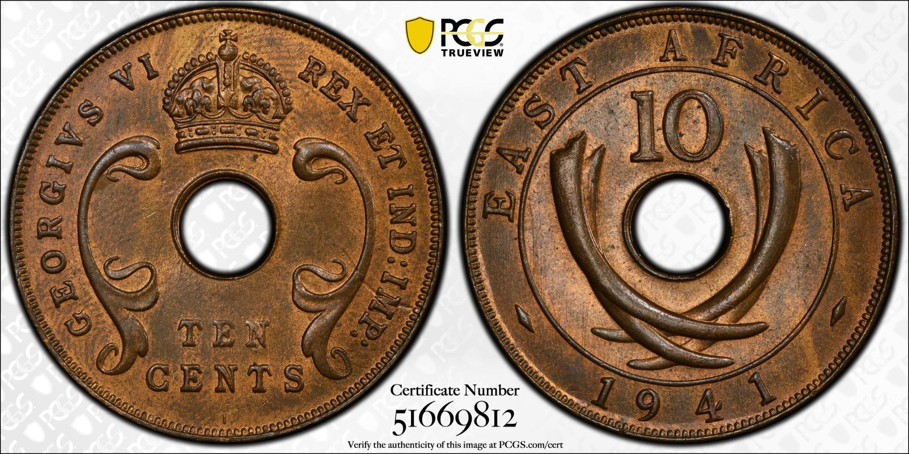 EAST AFRICA & UGANDA: George VI, 1936-1952, AE 10 cents, 1941-I, PCGS MS63 RB