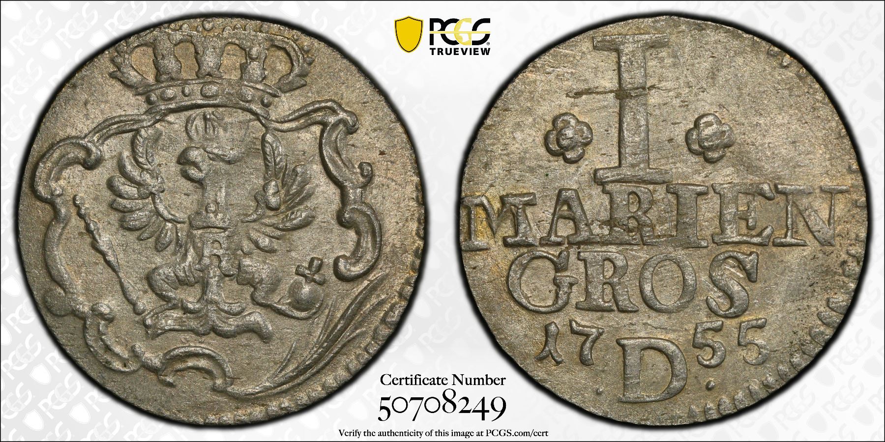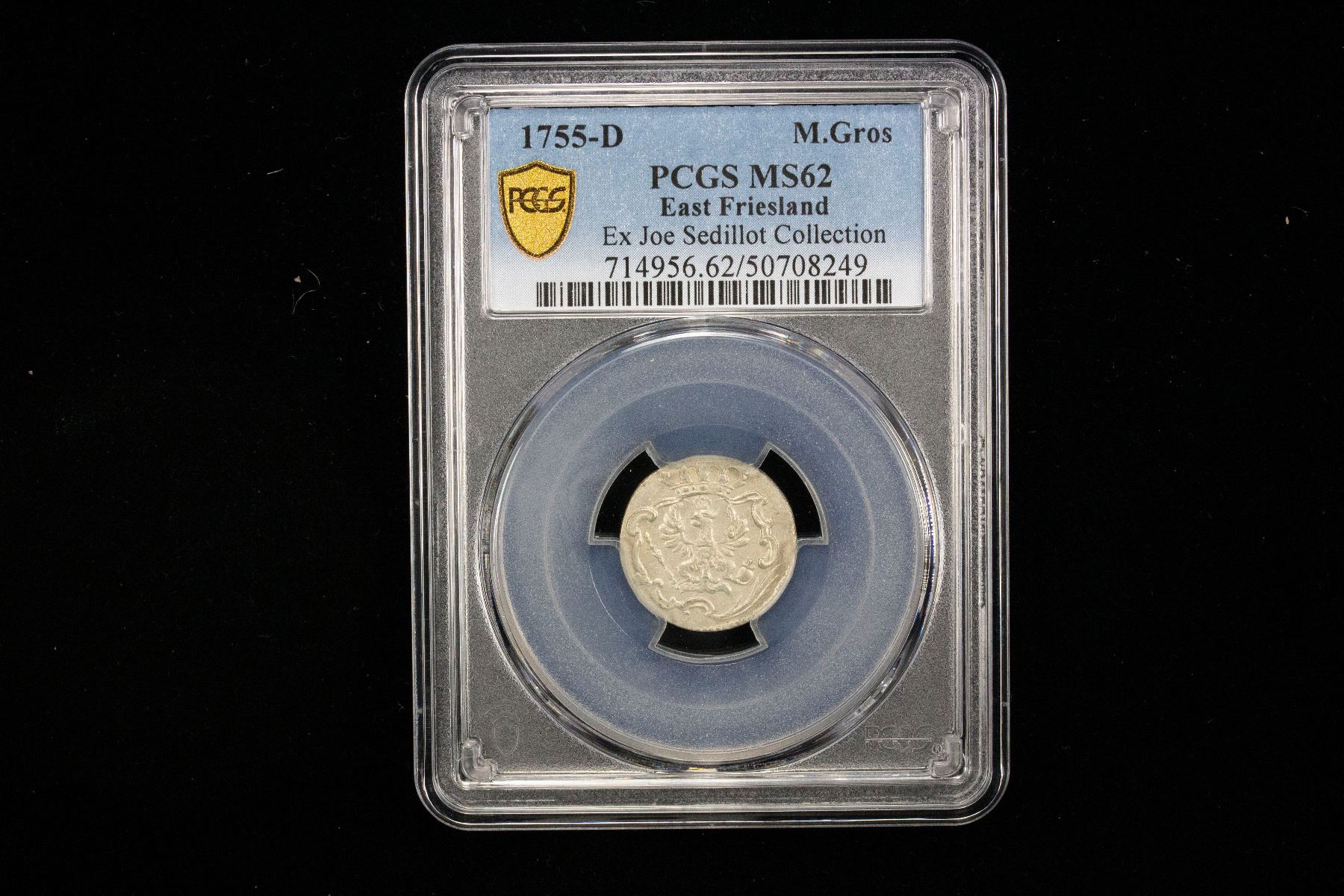 EAST FRIESLAND: Friedrich II, 1740-1786, BI mariengroschen, Aurich, 1755-D, KM-215, a pleasing lustrous example! PCGS graded MS62, ex Joe Sedillot Collection. Frederick II was King of Prussia and the 14th Prince-Elector of Brandenburg as well.