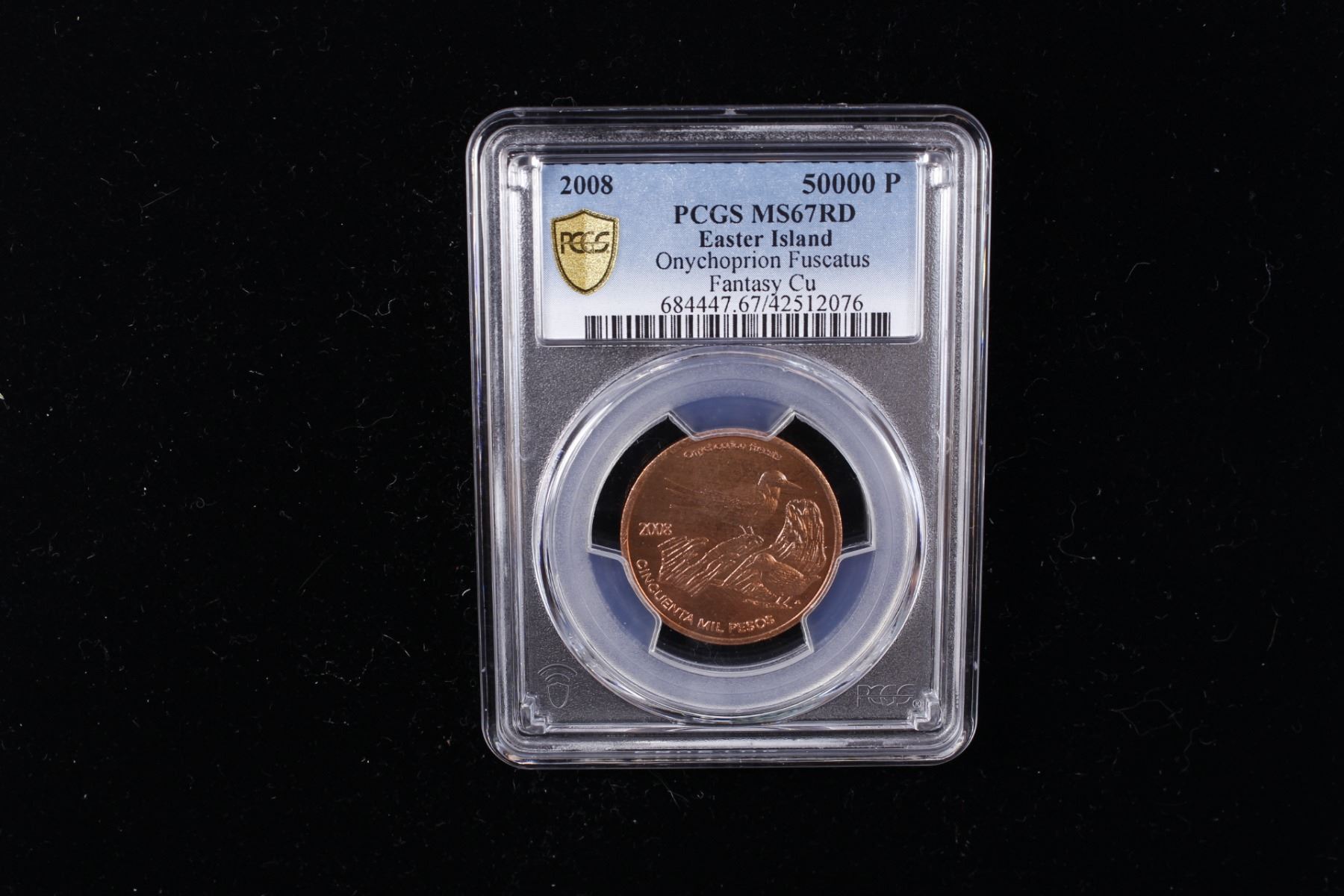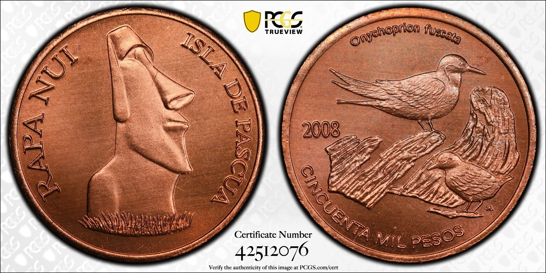EASTER ISLAND: Rapa Nui, AE 50,000 pesos, 2008, KM-X9a, Wildlife Protection Series - Sooty Tern (Onychoprion fuscatus), fantasy pattern essai in pure copper, mintage of only 30 pieces, very rare, PCGS graded MS67 RD. Private pattern struck at the Patrick Mint. The mint began operating in 1972 and was known for striking mainly tokens until the mint was destroyed in the 2017 Tubbs Fire in the "Northern California Firestorm" along with 5,642 other structures in Santa Rosa, California.