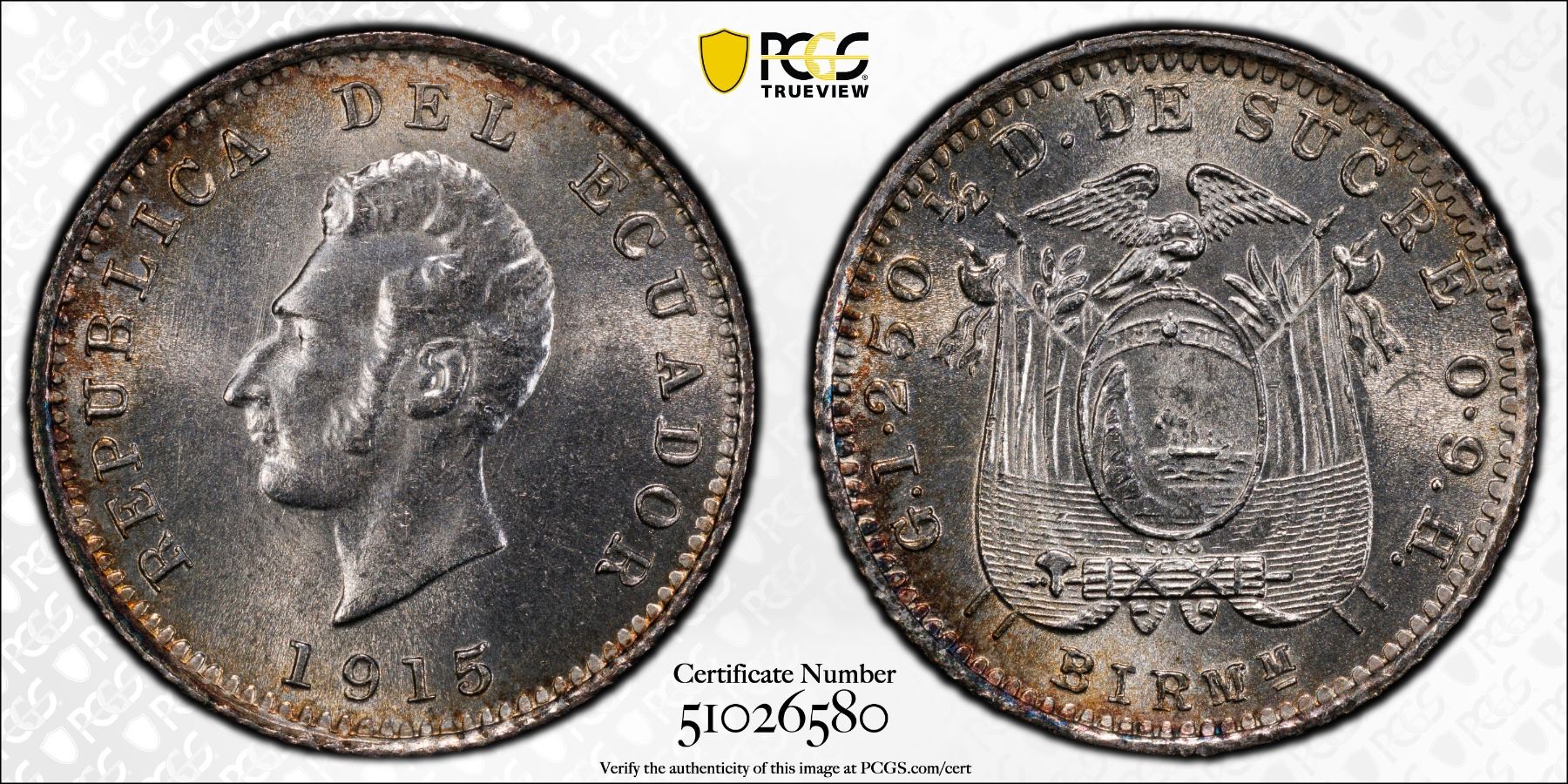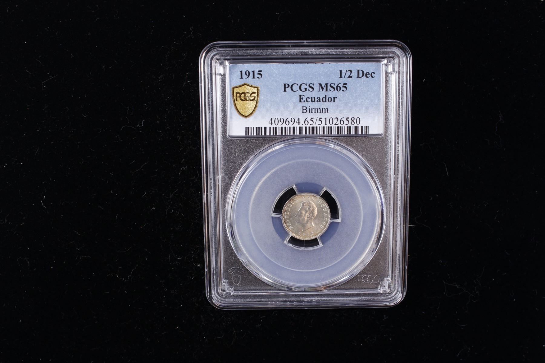ECUADOR: Republic, AR 1/2 decimo, Birmingham, 1915, KM-55.2, a superb lustrous example! PCGS graded MS65.
