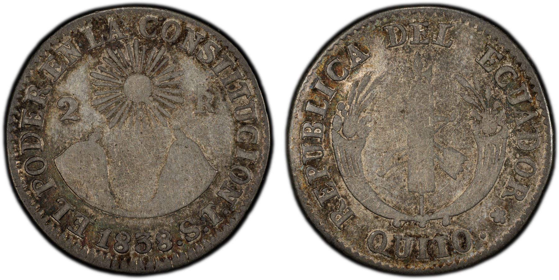 ECUADOR: Republic, AR 2 reales, Quito, 1838, KM-18, assayer ST, PCGS graded F15.