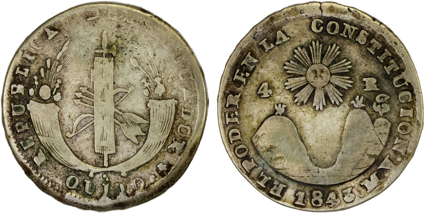 ECUADOR: Republic, AR 4 reales, 1843, KM-24, initials MV, somewhat weakly struck, key date, Fine.