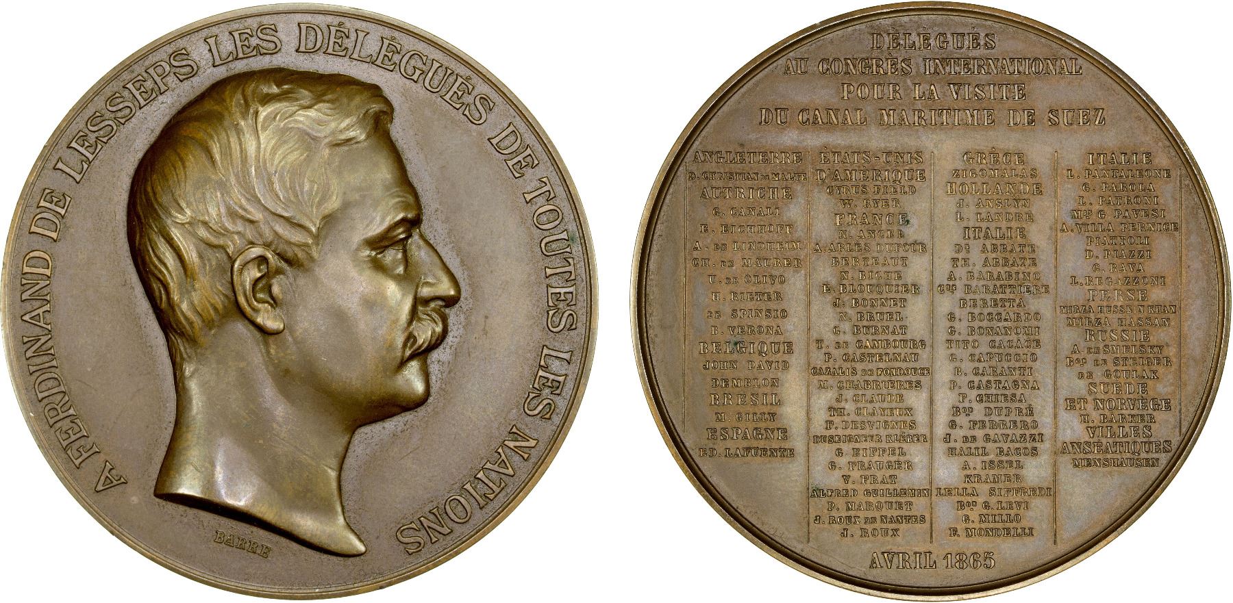 EGYPT: AE medal (117g), "1865", Wurzbach-5144. MdP-3-20b, Divo-501, 60mm; bronze tribute medal for the Congrès International des Délégués and the Visit to the Suez Canal, by Barre: bust right with A FERDINAND DE LESSEPS LES DÉLÉGUÉS DE TOUTES LES NATIONS around // DÉLÉGUÉS / AU CONGRÈS INTERNATIONAL / POUR LE VISITE / DU CANAL MARITIME DE SUEZ with names of the delegates in tiny lettering in four columns below and "AVRIL 1865" at bottom, BRONZE and cornucopia privy mark on edge (the cornucopia dates the medal to after 1880), choice XF.