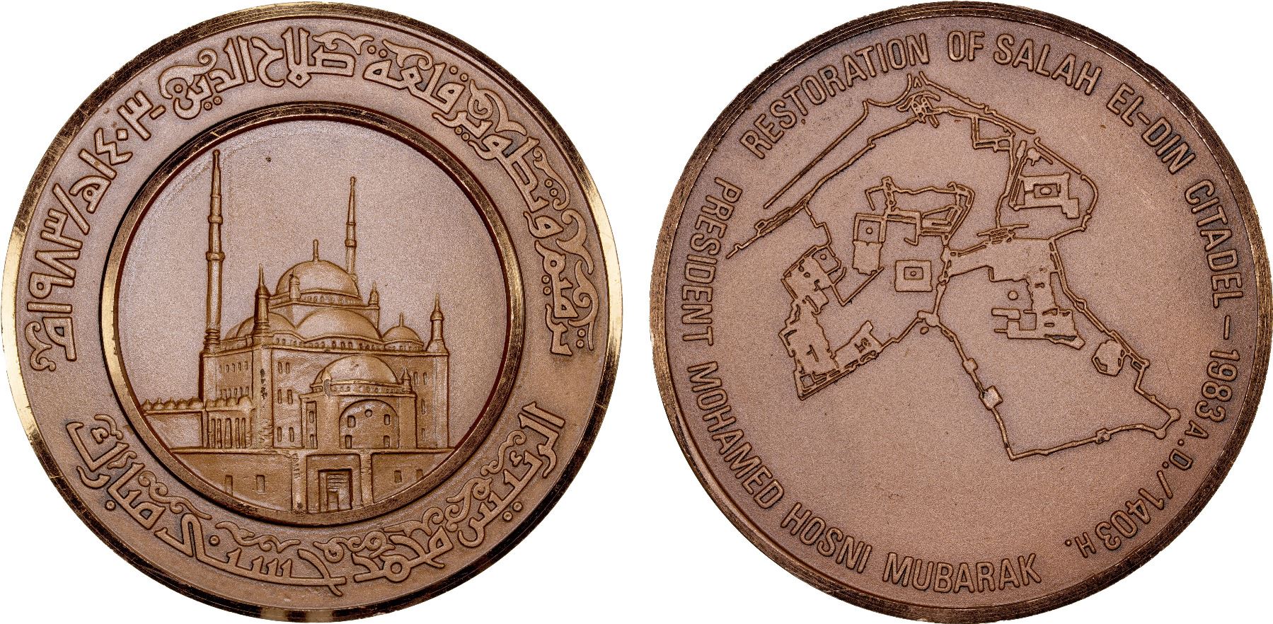 EGYPT: AE medal (135g), 1983/AH1403, 70.5mm; Restauration of Salah el-Din Citadel, President Mohamed Husni Mubarak: map of the Citadel // same legend on Arabic, view of the Muhammad Ali Mosque; in red box, signed by a company called Etalex Metal. Medal maker unknown, possibly Chinese; style seems to be much later than 1983, possibly later than 2000.