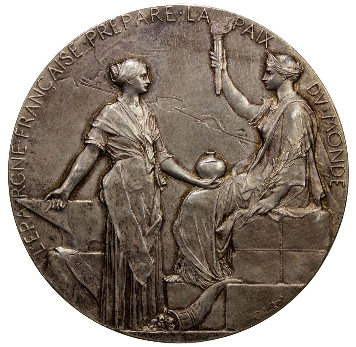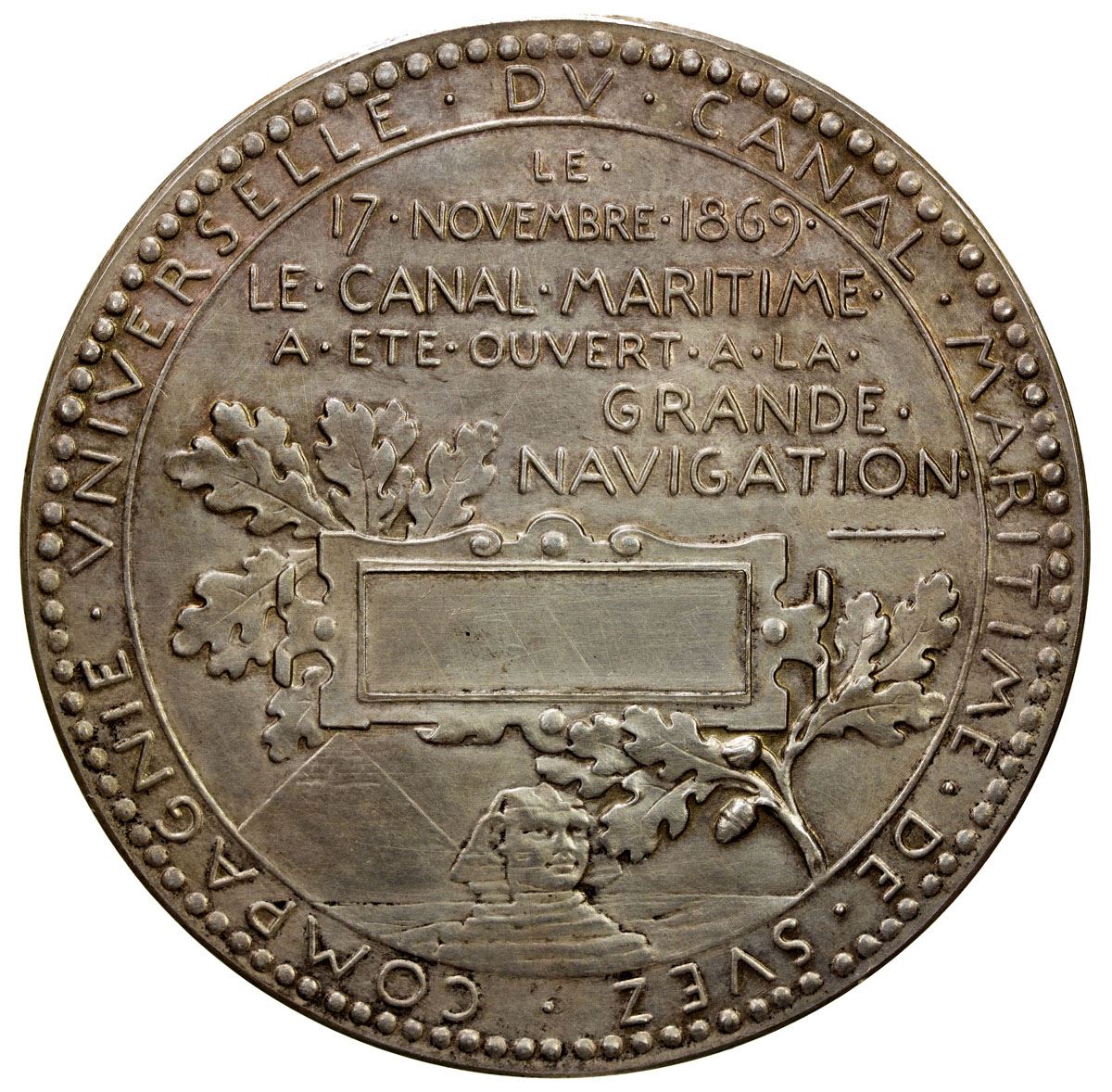 EGYPT: AR medal, 1869, 60mm, Paris Mint Suez Canal Completion Silver Medal by Oscar Roty, L'EPARGNE FRANÇAISE PREPARE LA PAIX DV MONDE around two allegorical figures symbolizing Commerce and Labor depicted in front of a representation of the Suez Canal, one with vase, the other seated on bale, holding torch and olive branch, cornucopia at her feet; in background, map of the canal // COMPAGNIE VNIVERSELLE DV CANAL MARITIME DE SVEZ in outer margin, Pyramid, Sphinx and oak sprig in which a scroll resides, LE / 17 NOVEMBRE 1869 / LE CANAL MARITIME / A ETE OUVERT A LA / GRANDE / NAVIGATION, on edge 2ARGENT and cornucopia privy mark, EF. This medal is the work of Oscar Roty in 1889. Possible official restrike of the Paris mint with cornucopia (Corne d'abondance) privy mark, struck from 1880 to 1898 and again in 1901.
