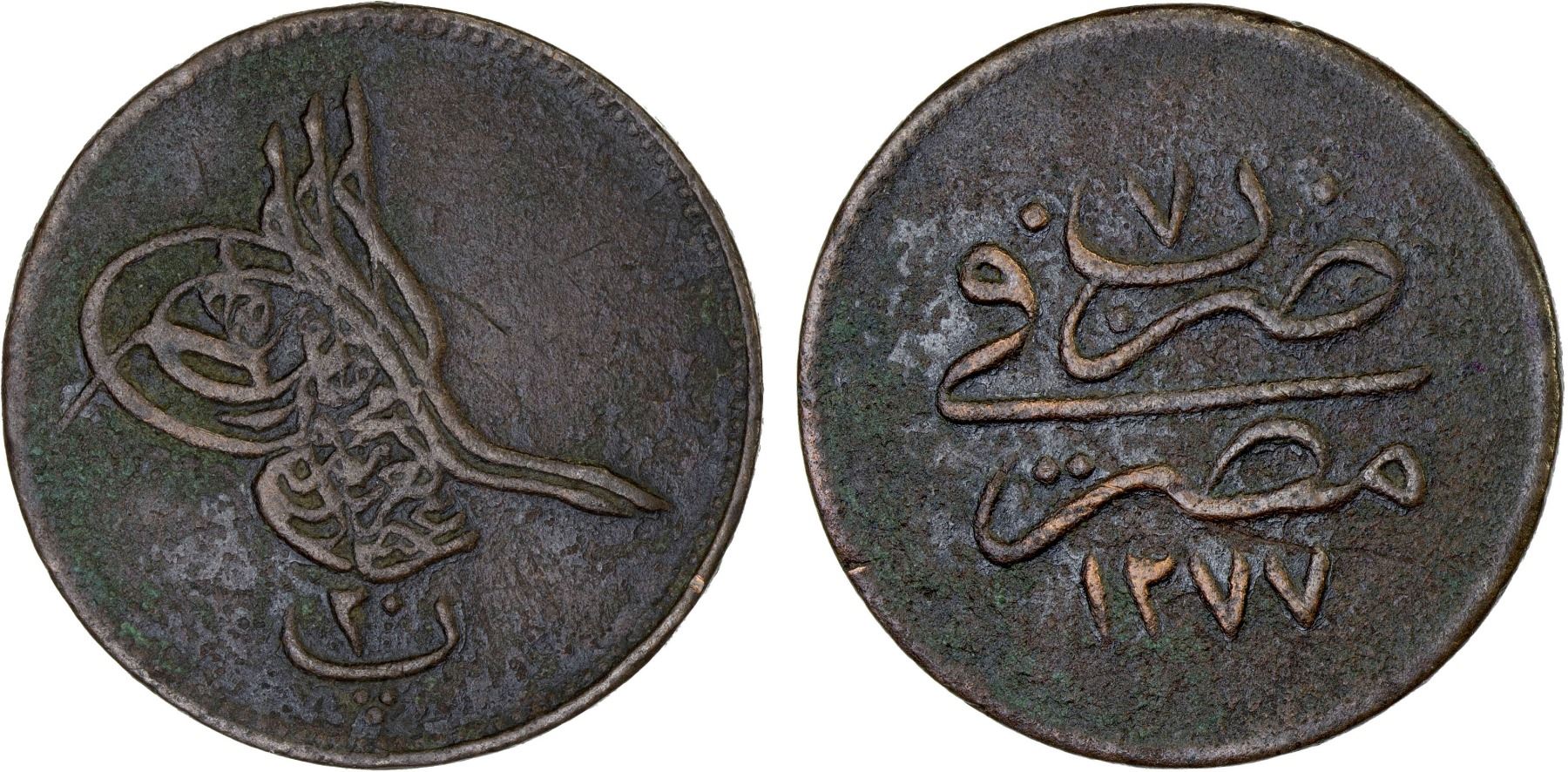 EGYPT: Abdul Aziz, 1861-1876, AE 20 para (12.57g), Misr, AH1277 year 7, VF