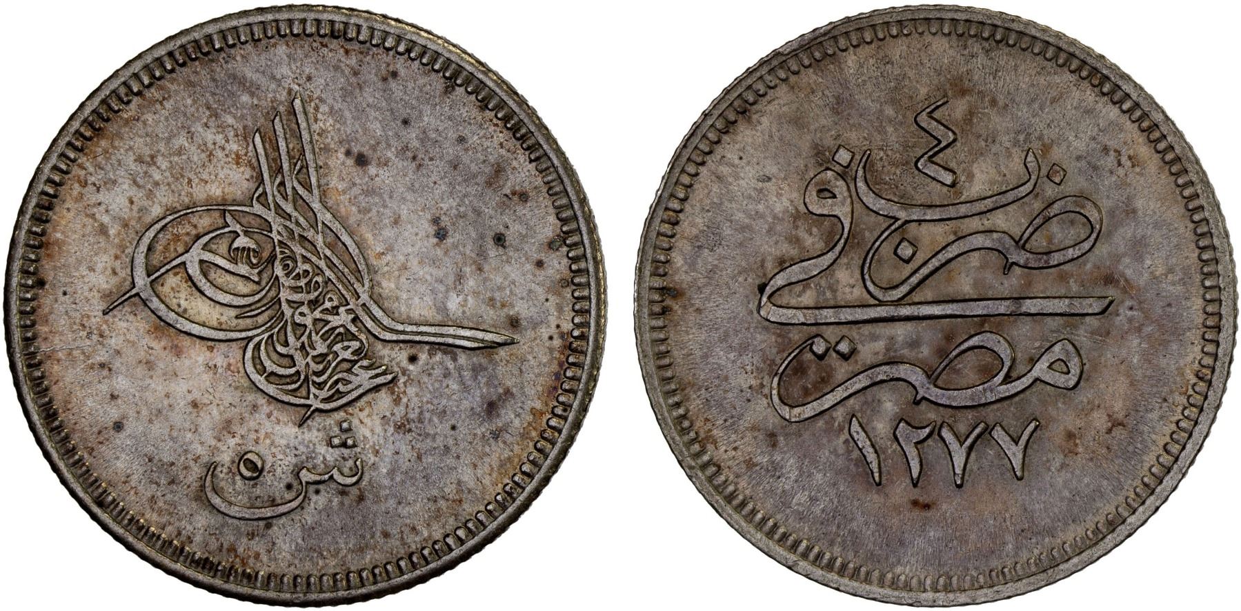 EGYPT: Abdul Aziz, 1861-1876, AR 5 qirsh, AH1277 year 4, KM-253.1, lightly toned, a bit speckled on the obverse, one-year type, Choice XF.