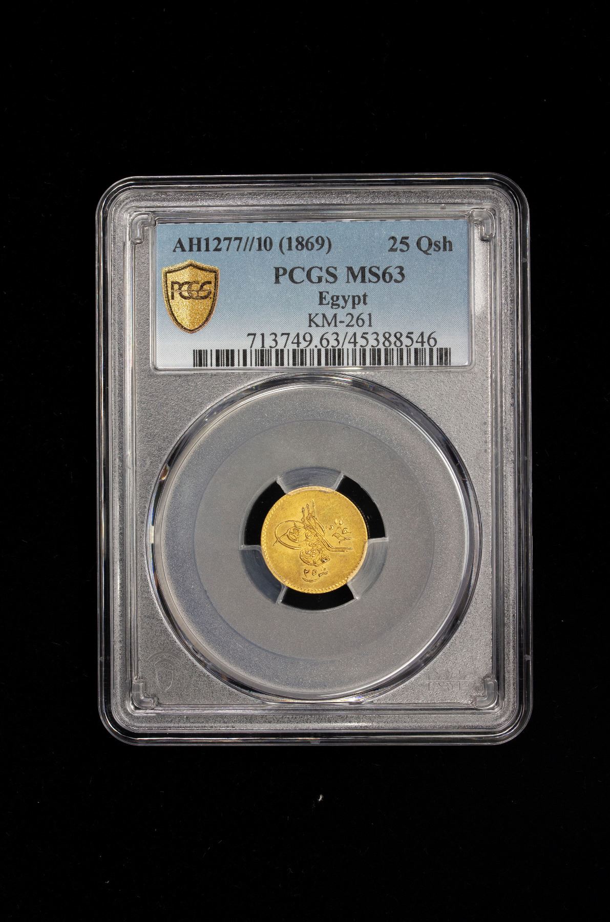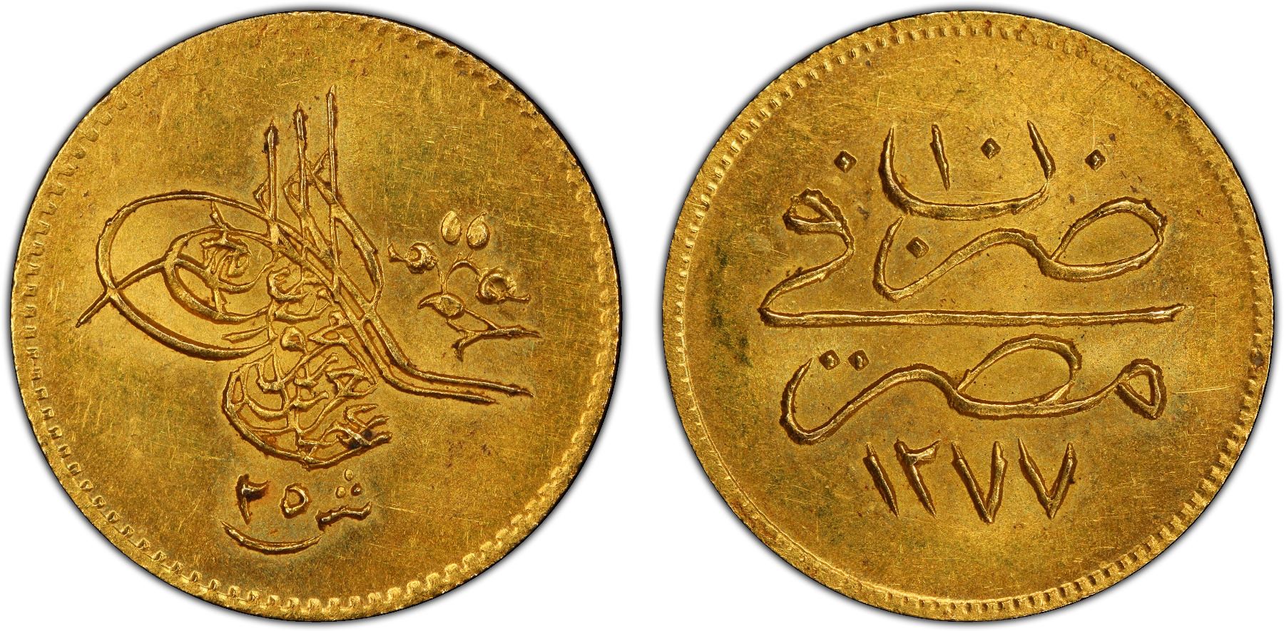 EGYPT: Abdul Aziz, 1861-1876, AV 25 qirsh, Misr, AH1277 year 10, PCGS MS63