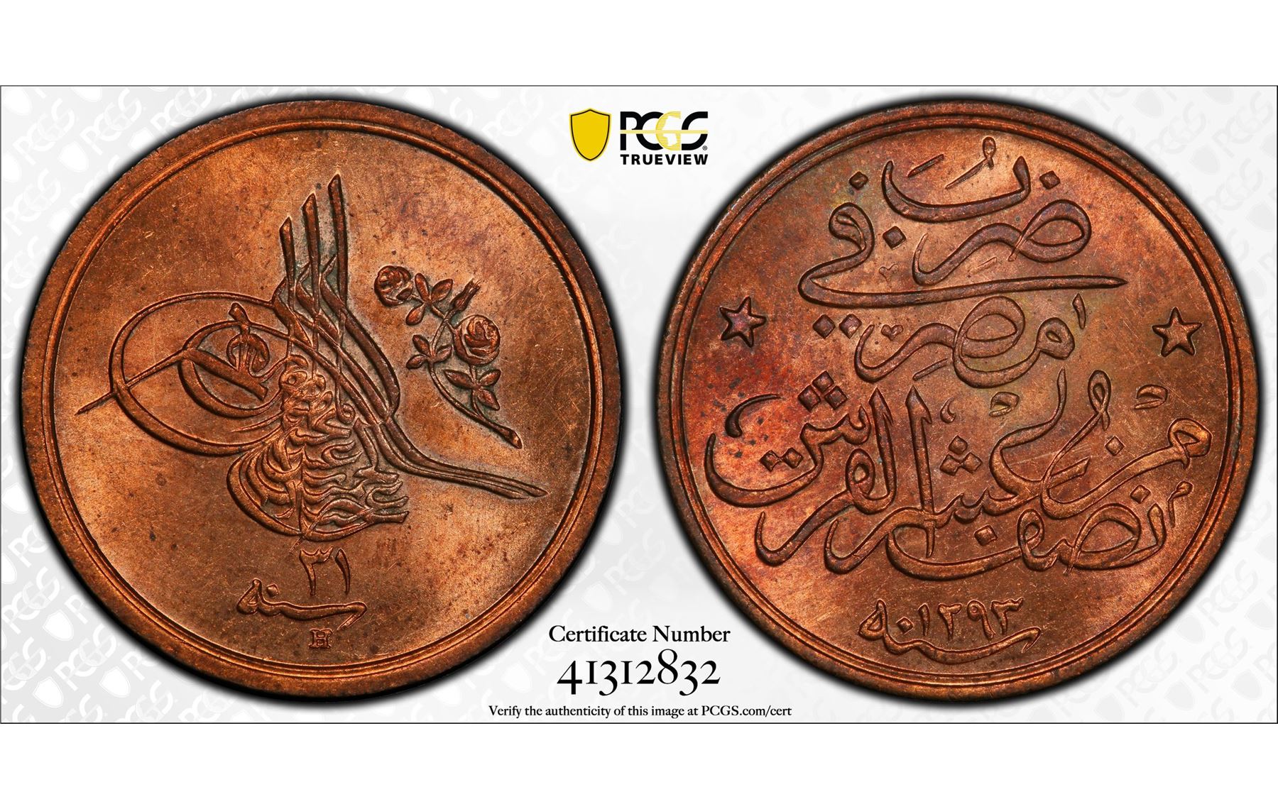 EGYPT: Abdul Hamid II, 1876-1909, AE 1/20 qirsh, Misr, AH1293 year 31. PCGS MS64 RB