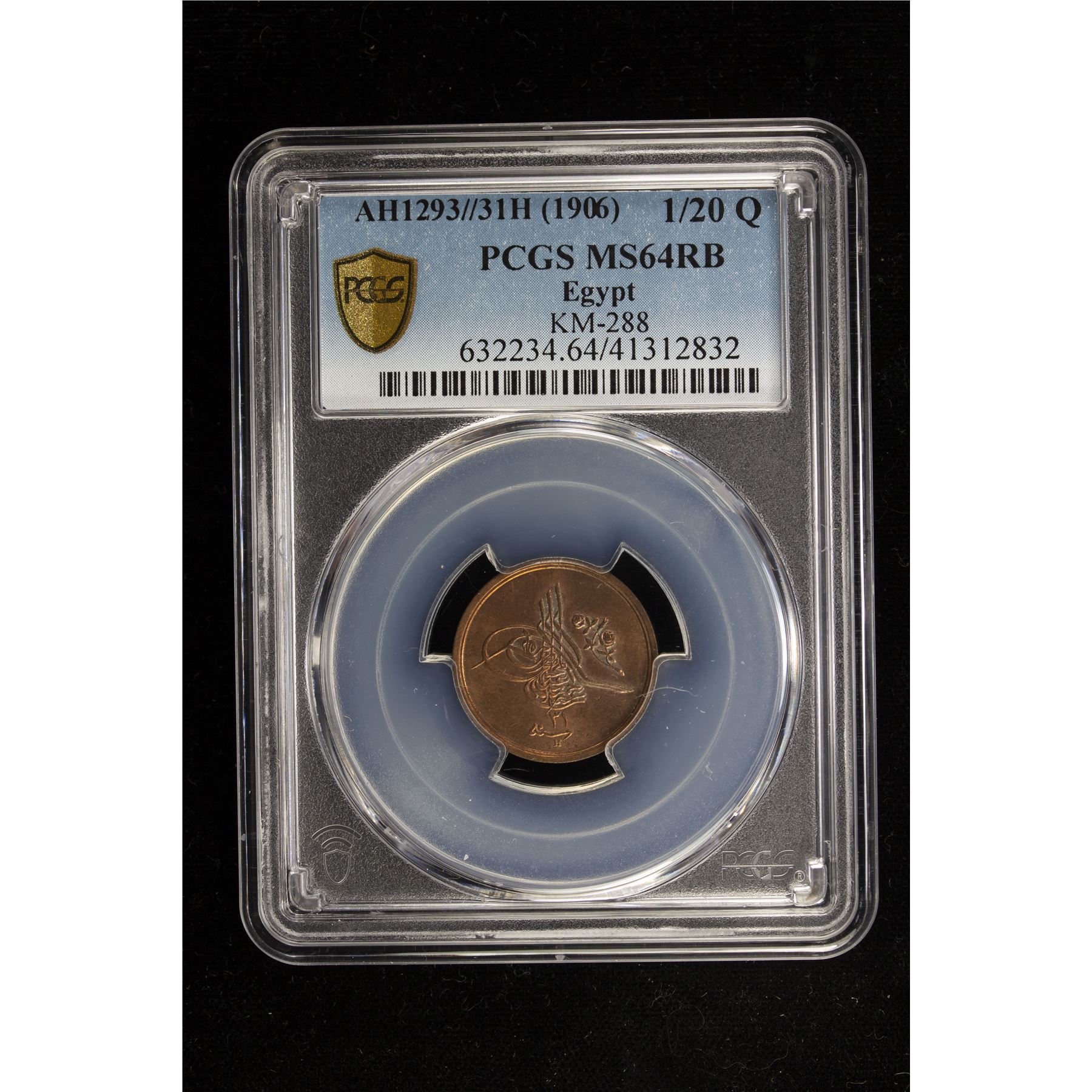EGYPT: Abdul Hamid II, 1876-1909, AE 1/20 qirsh, Misr, AH1293 year 31, KM-288, a lovely quality example! PCGS graded MS64 RB. Struck at the Heaton mint, Birmingham.
