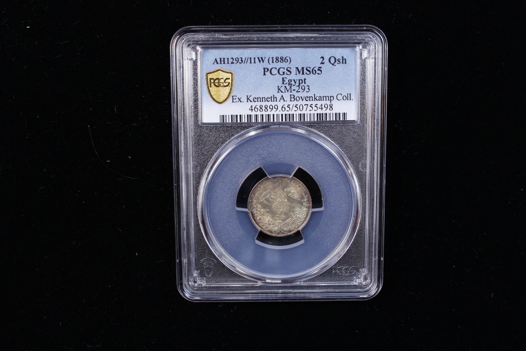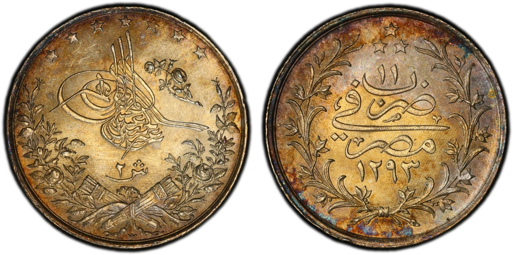 EGYPT: Abdul Hamid II, 1876-1909, AR 2 qirsh, Misr, AH1293 year 11 (1886), KM-293, lightly toned, superb luster, PCGS graded MS65, ex Kenneth A. Bovenkamp Collection. The initial W stands for the designer Emil Weigand at the Berlin Mint.
