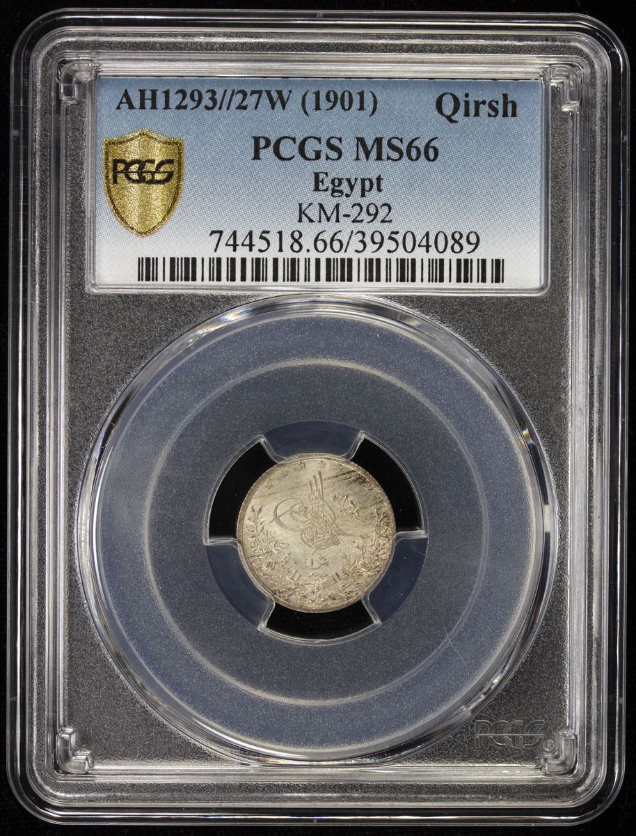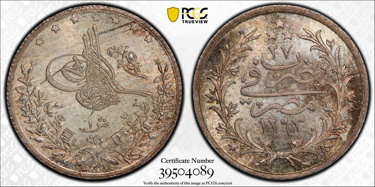 EGYPT: Abdul Hamid II, 1876-1909, AR qirsh, Misr, AH1293 year 27, KM-292, a fantastic quality example! PCGS graded MS66. The initial W stands for the designer Emil Weigand at the Berlin Mint.