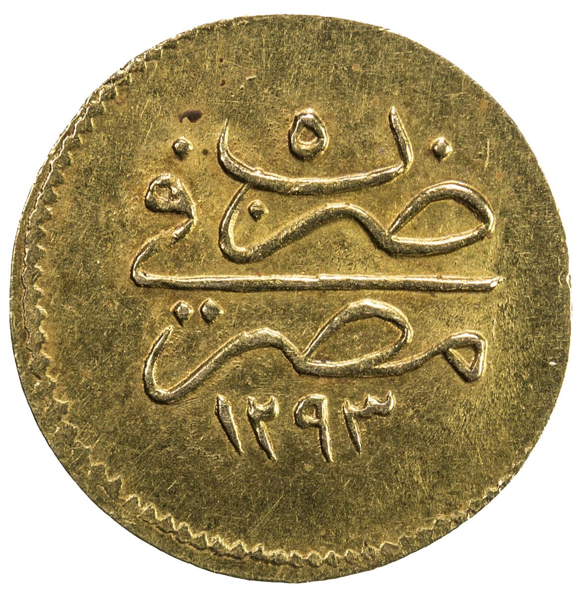 EGYPT: Abdul Hamid II, 1876-1909, AV 5 qirsh, Misr, AH1293 year 5, KM-280, AU.