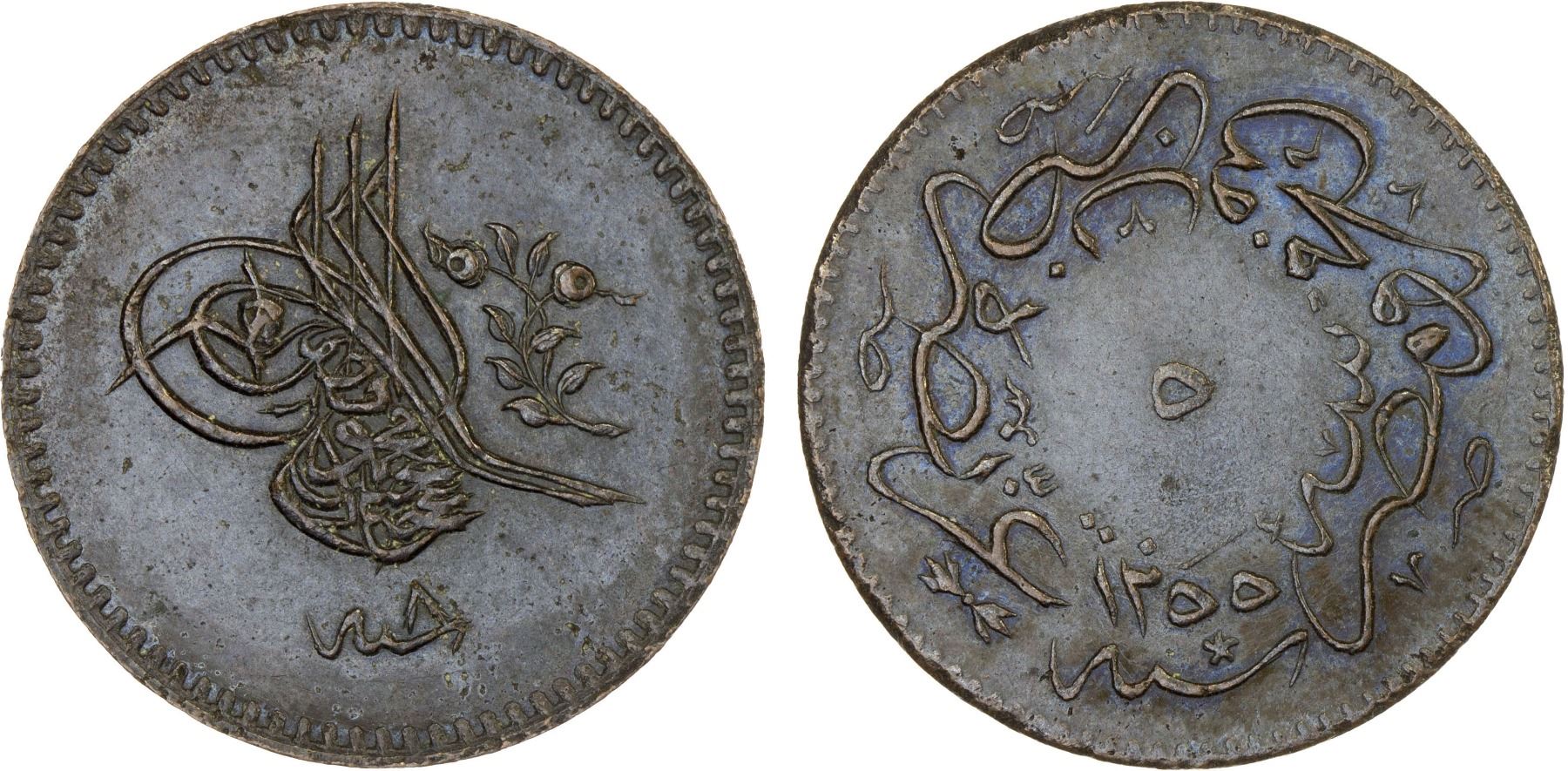 EGYPT: Abdul Mejid, 1839-1861, AE 5 para (6.62g), Misr, AH1255 year 8, Unc