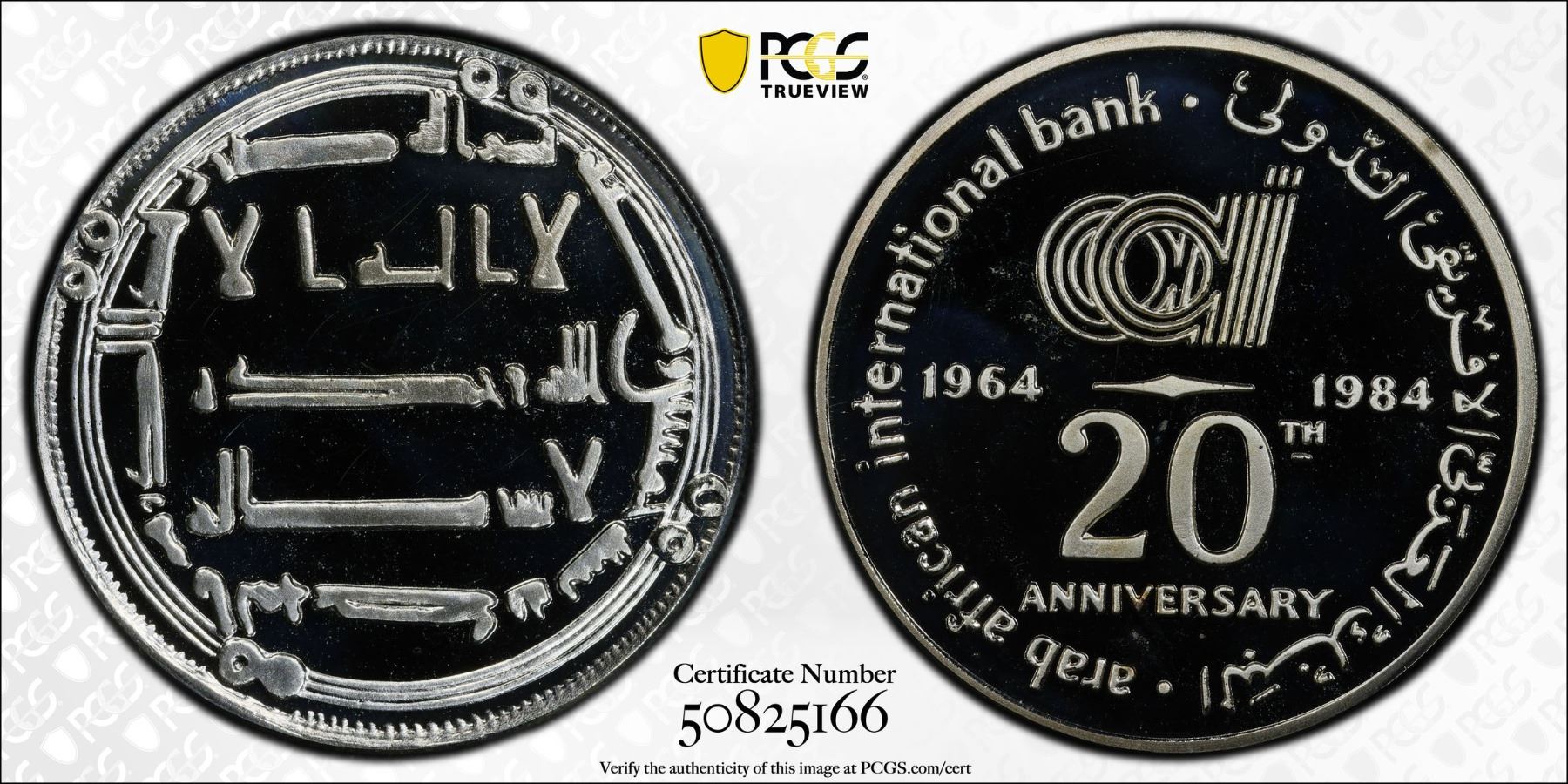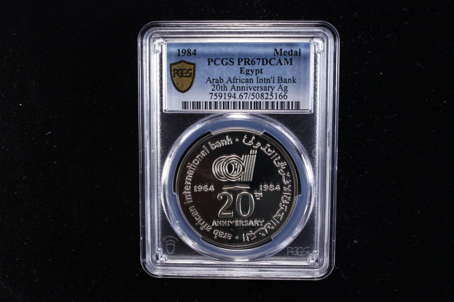 EGYPT: Arab Republic, AR medal (28.08g), 1984, N-121950, 36mm, comemorating the Arab African International Bank 20th Anniversary, AAIB logo // copy of the obverse of an Abbasid dirham struck at al-Muhammadiya and dated AH150, a stunning reflective proof state example! PCGS graded MS67 DCAM.