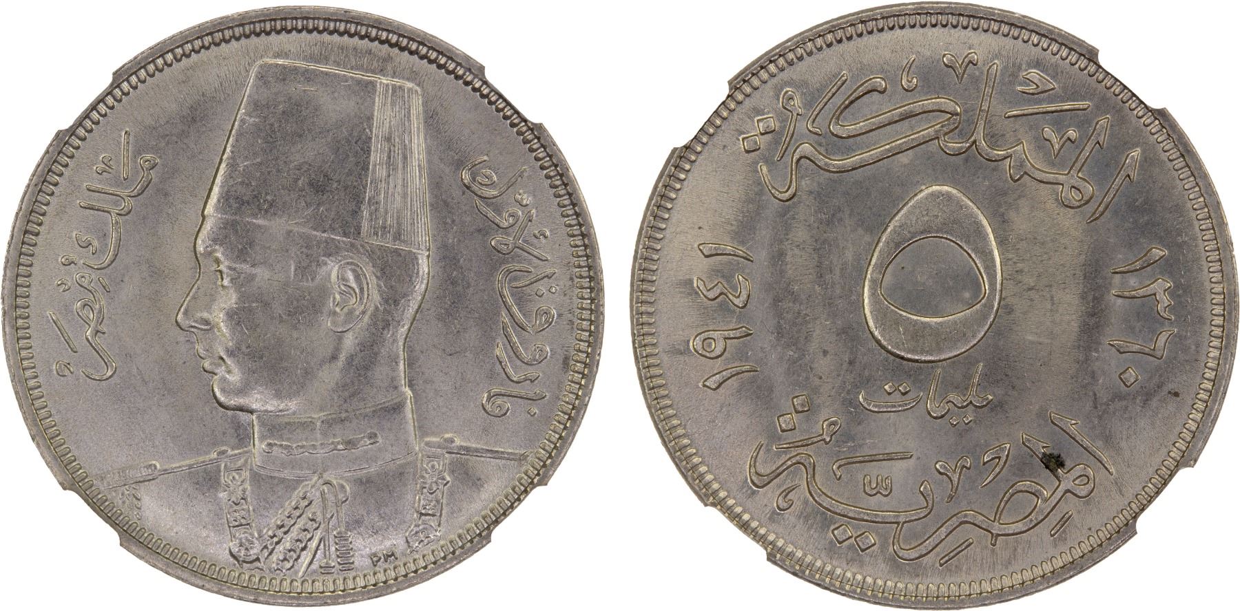 EGYPT: Farouk, 1936-1952, 5 milliemes, 1941/AH1360, NGC MS63