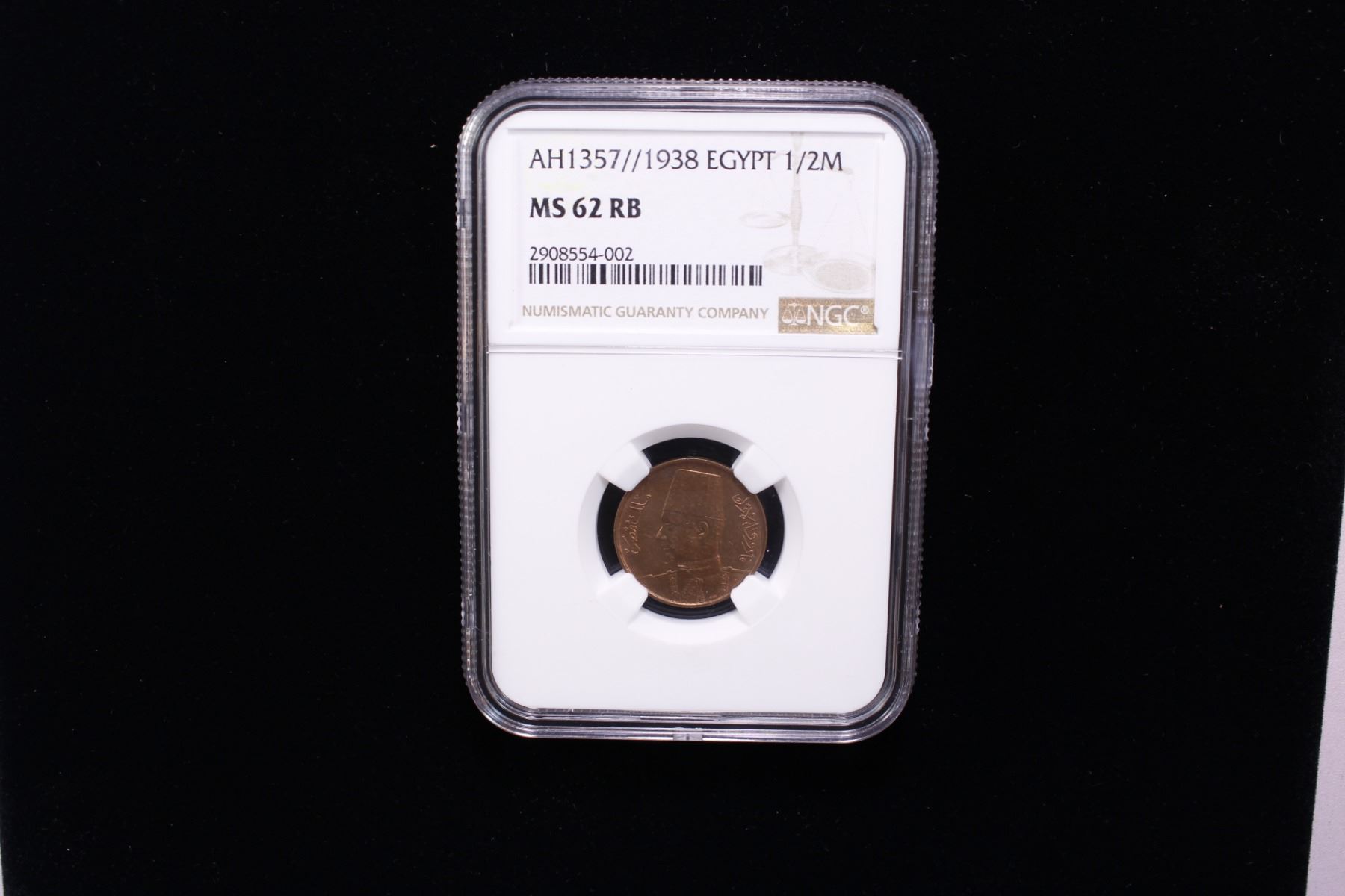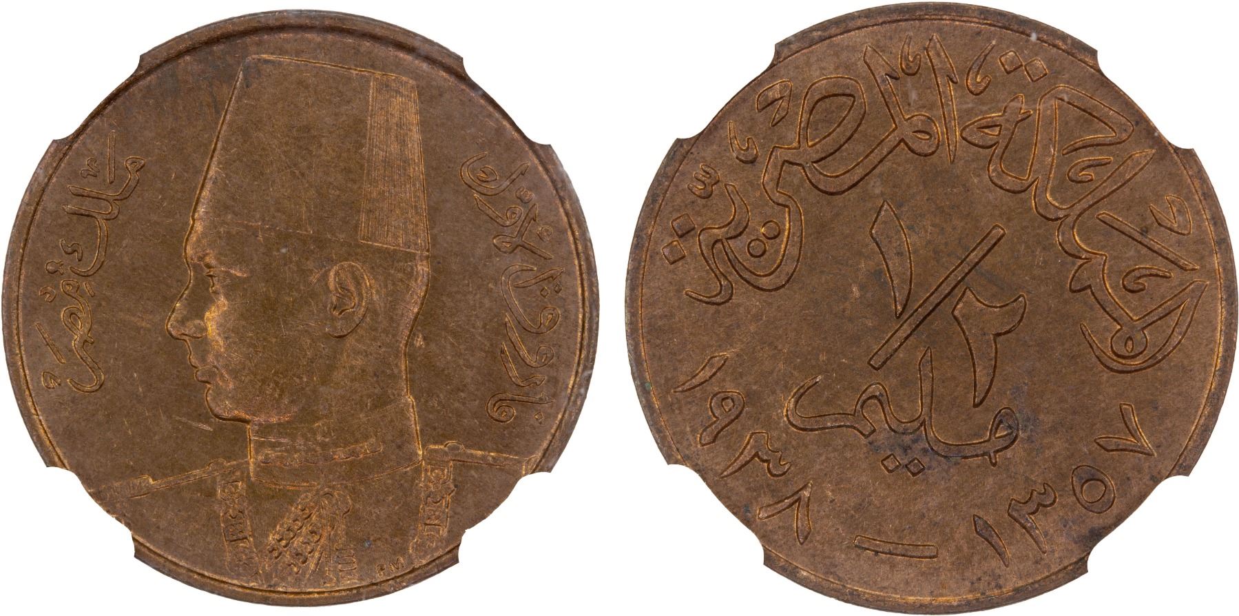 EGYPT: Farouk, 1936-1952, AE 1/2 millieme, 1938/AH1357, NGC MS62 RB