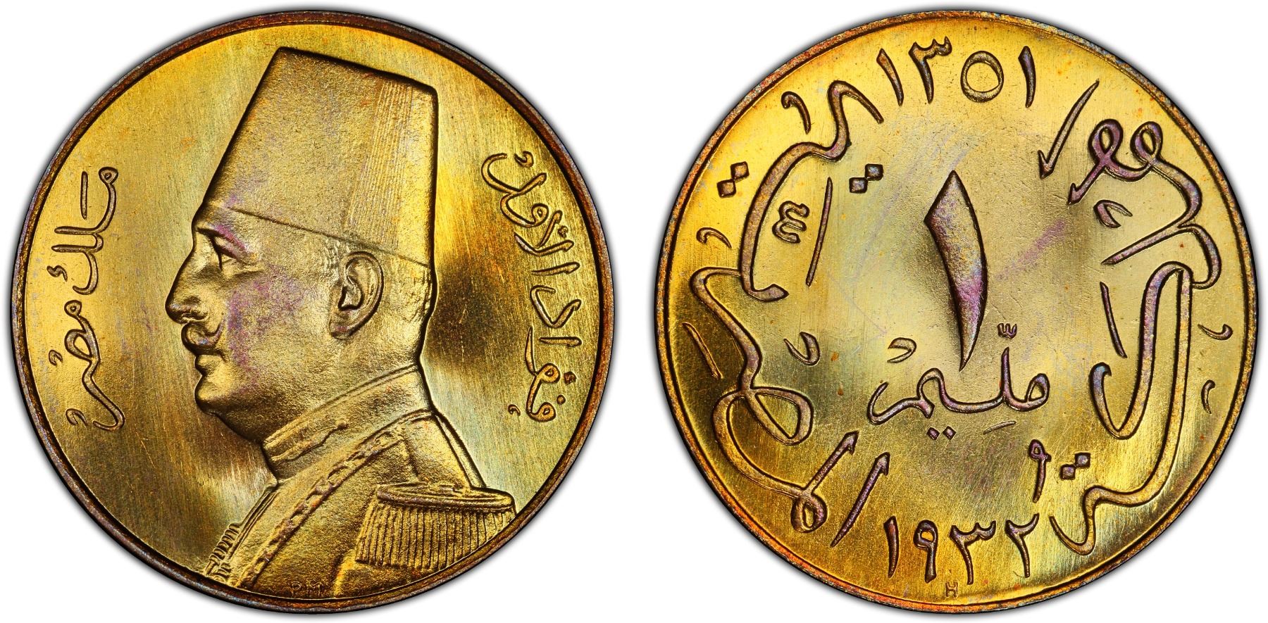 EGYPT: Fuad I, King, 1922-1936, AE millieme, 1932/AH1351, PCGS Specimen 66 RB