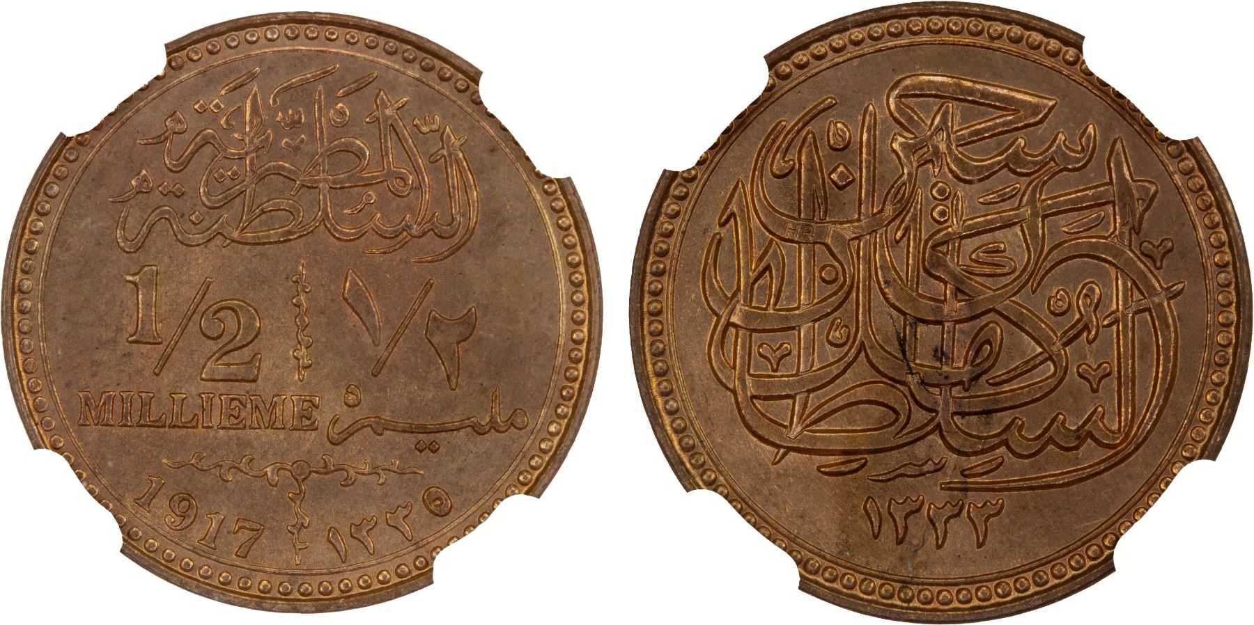 EGYPT: Hussein Kamil, 1914-1917, AE 1/2 millieme, 1917/AH1335, NGC MS65 RB