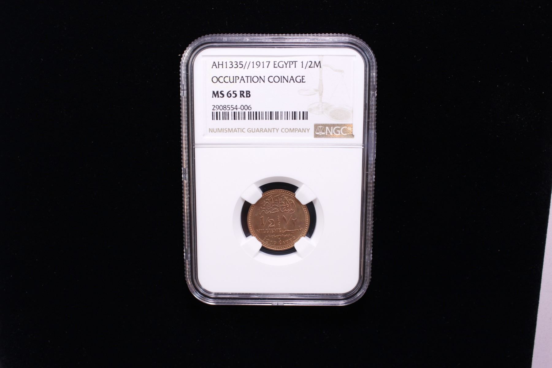 EGYPT: Hussein Kamil, 1914-1917, AE 1/2 millieme, 1917/AH1335, KM-312, struck at the Calcutta mint, British India, a superb mostly red lustrous example! NGC graded MS65 RB.