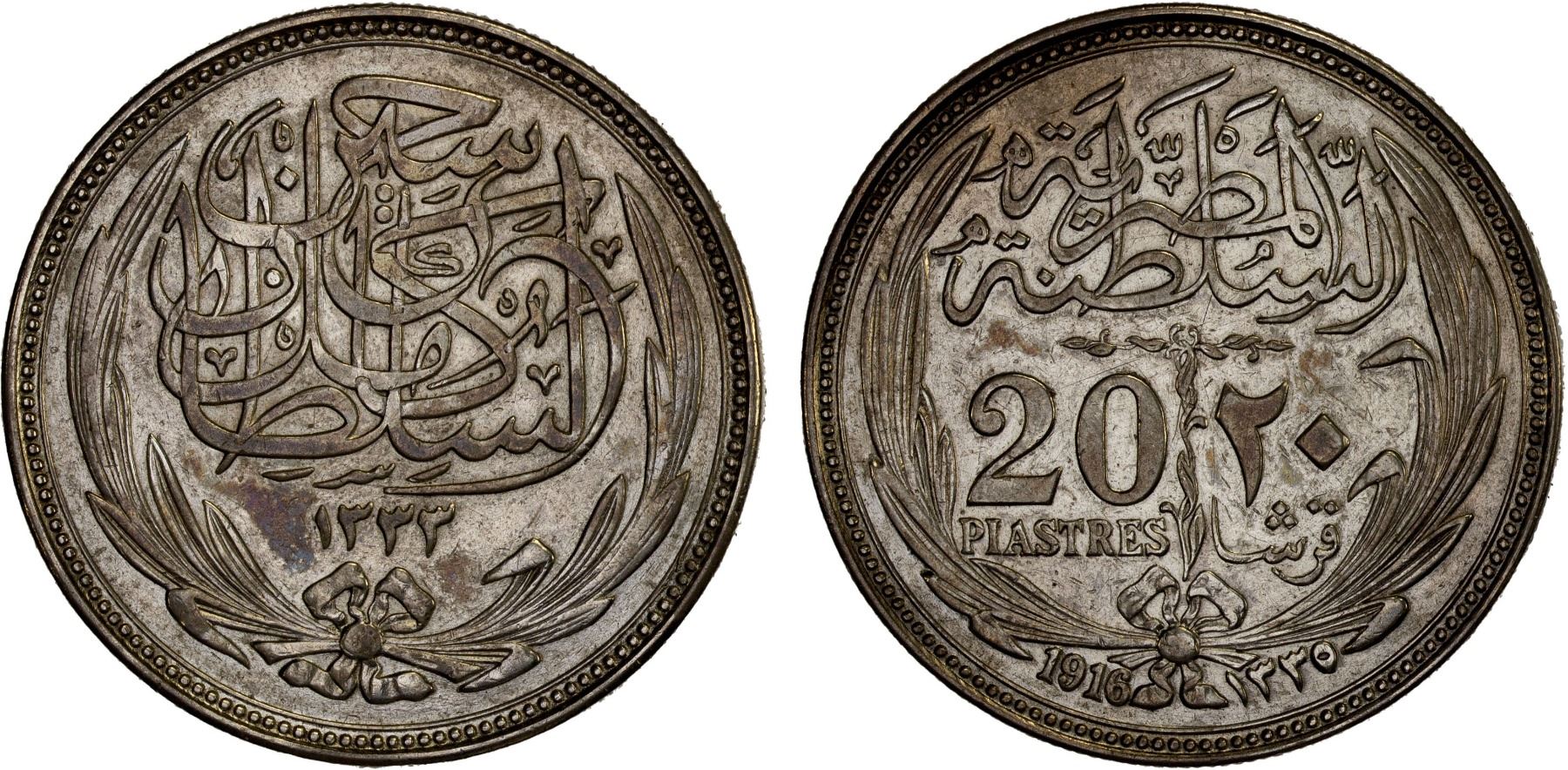 EGYPT: Hussein Kamil, 1914-1917, AR 20 pisatres, 1916/AH1335, XF