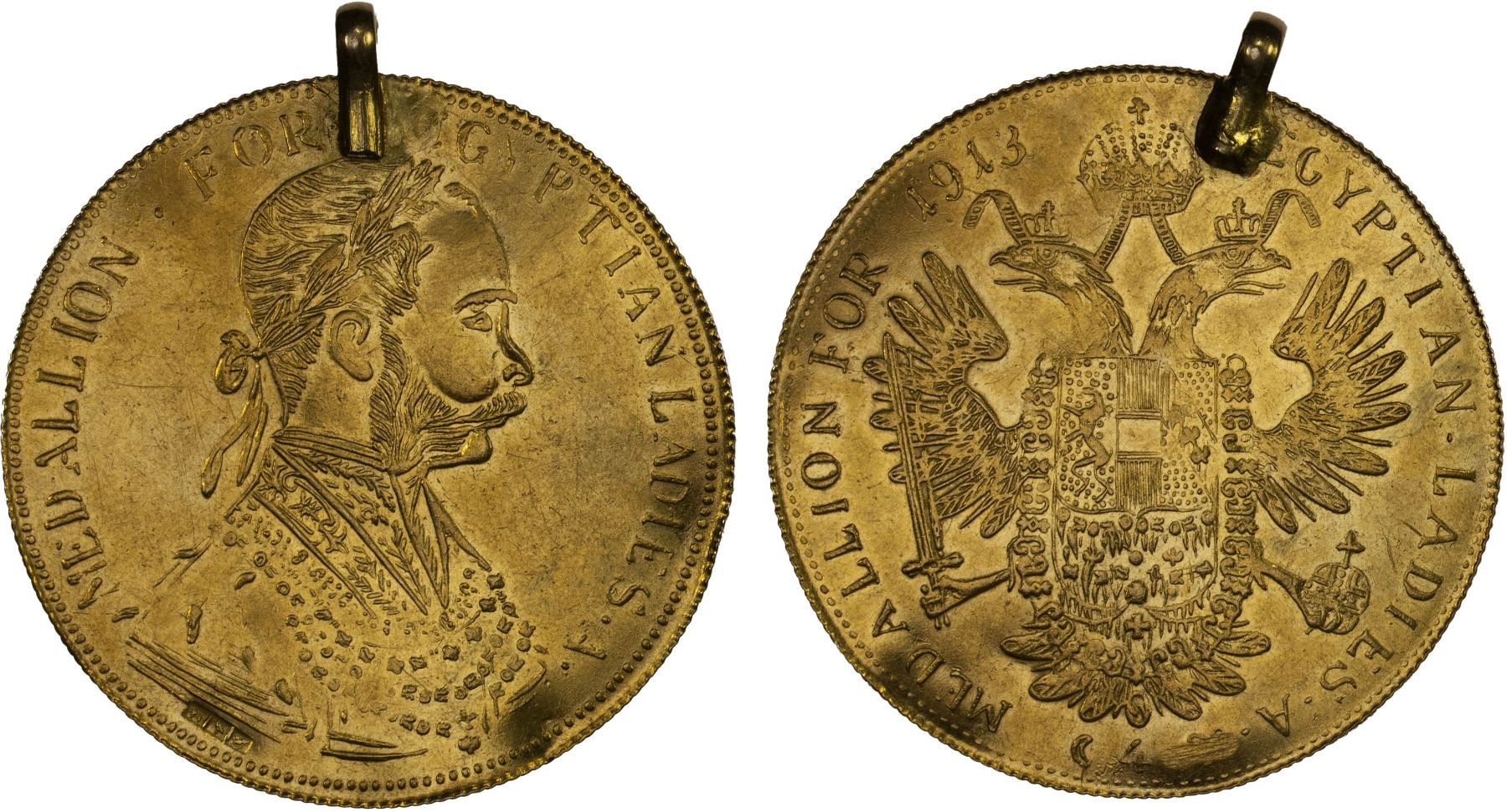 EGYPT: Jeweler's Issues, AV 4 ducat (9.57g), 40mm jeweler's light weigh imitation of an Austrian 4 ducat of Franz Joseph; MEDALLION FOR EGYPTIAN LADIES A around bust of Austrian emperor // MEDALLION FOR EGYPTIAN LADIES A around Austrian imperial eagle, dated 1913 (sic), with mount, a very unusual item likely made in the 1920s, XF, ex Syed Rabbi Collection.