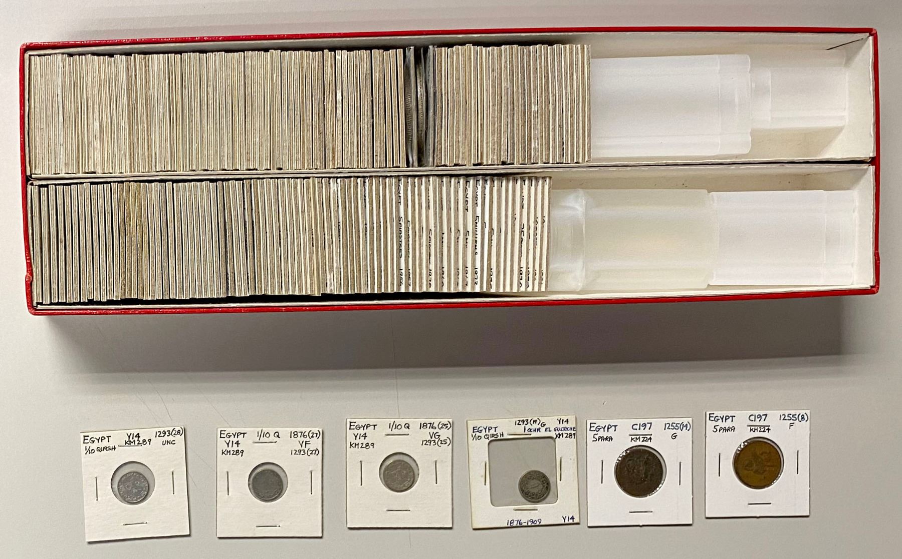 EGYPT: LOT of 172 coins, including Ottoman (49 pcs), British (16), Kingdom [32, with 20 piastres crowns (2)], and Republic (75), many of which are silver; retail value $900, lot of 172 pieces, ex Almer H. Orr III Collection.