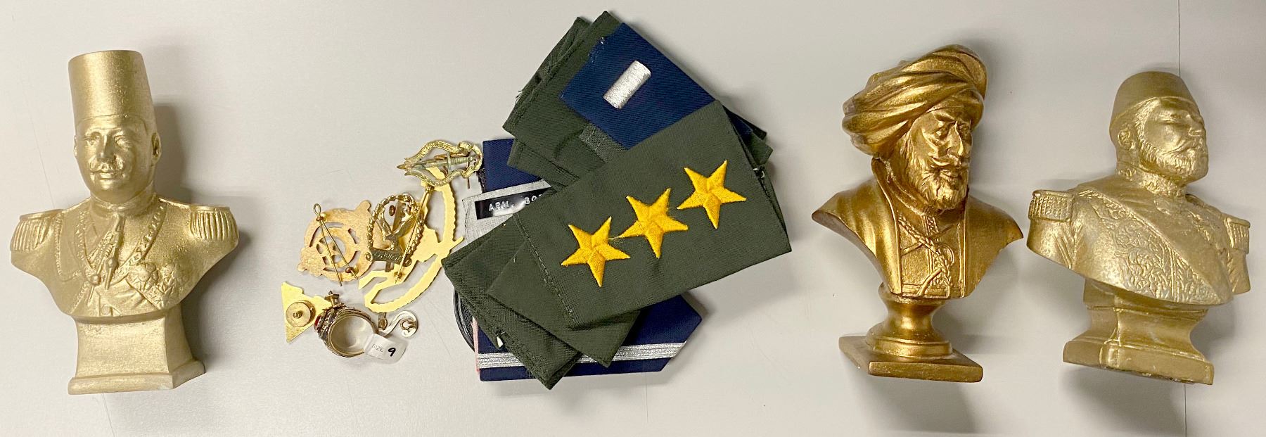 EGYPT: LOT of 4 objects, includes 3 modern statues of famous individuals (not named), probably copper on uncertain base, average 15-16mm in height, tourist items, probably from the 1980s or later; and group of about 12 cloth badge attachments and 6 small metal decorative items; retail value $250, lot of about 21 pieces.