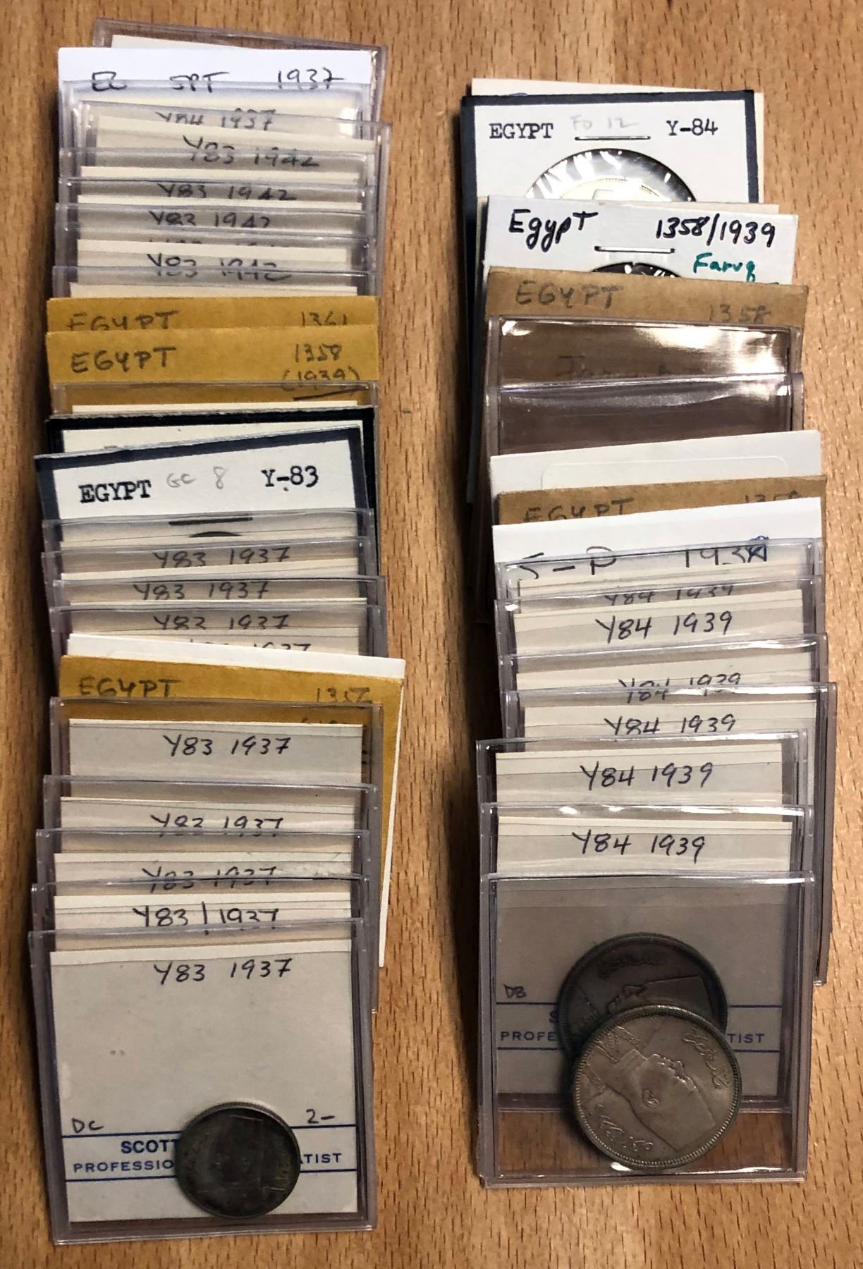 EGYPT:LOT of 48 silver minors of Farouk: 2 piastres: 1937/AH1365 (16 pcs), 1939/AH1358 (3), and 1942/AH1361 (7); and 5 piastres: 1937/AH1356 KM-366 (4) and 1939/AH1358 (18); better than average grades for most, including some Uncs (and a few choice), in consignor's 2x2 envelopes, retail value $900, lot of 48 pieces.
