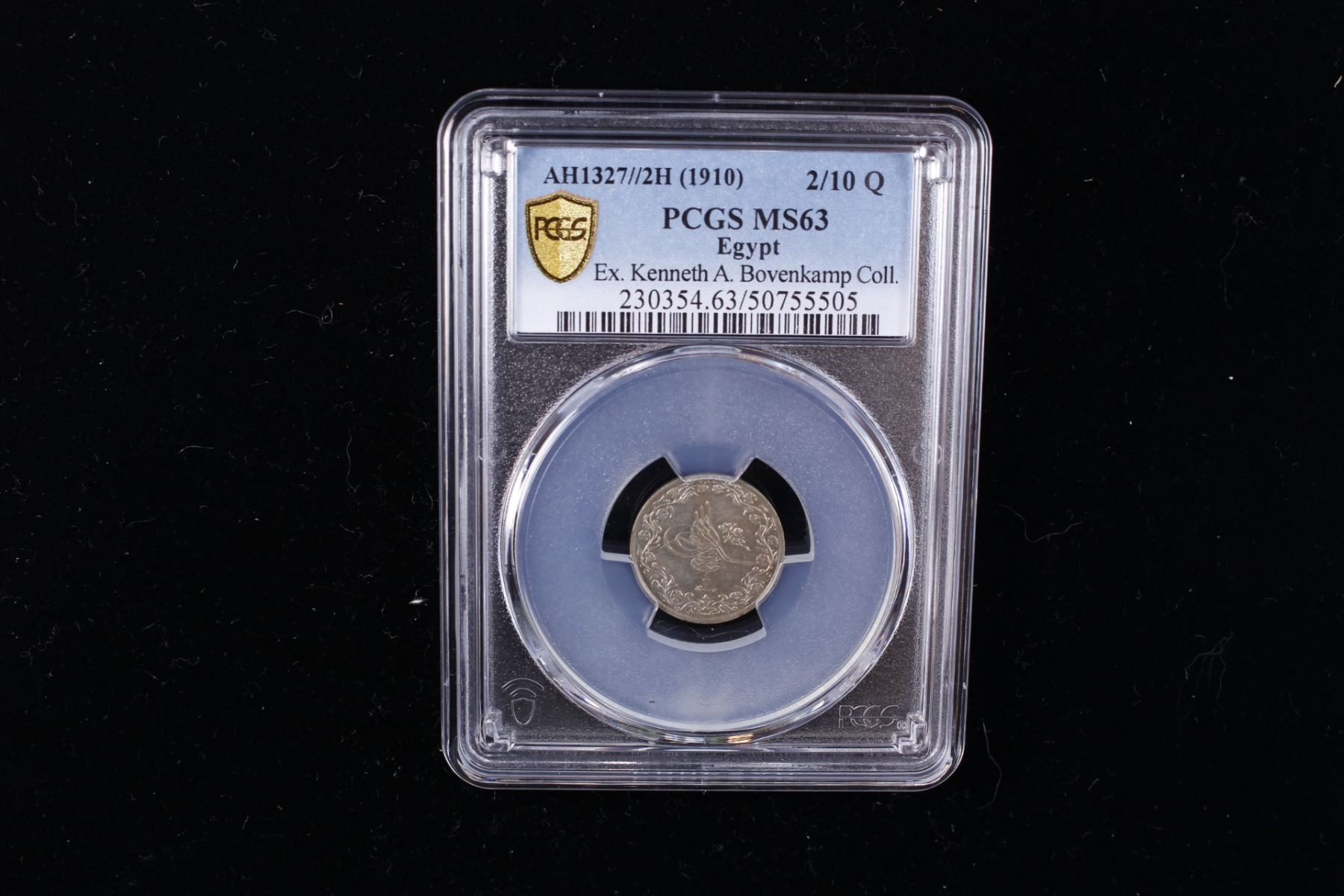 EGYPT: Mehmet V, 1909-1914, 2/10 qirsh, Misr, AH1327 year 2 (1910), KM-303, struck at the Heaton mint, Birmingham, a lovely lustrous mint state example! PCGS graded MS63, ex Kenneth A. Bovenkamp Collection.