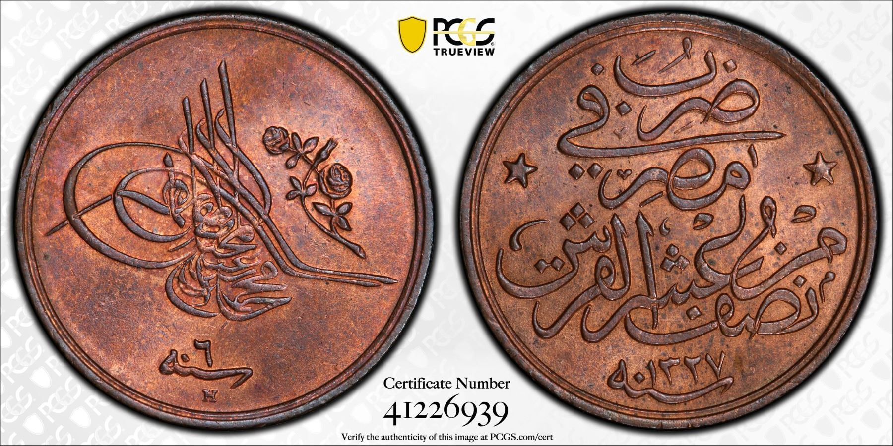 EGYPT: Muhammad V, 1909-1914, AE 1/20 qirsh, Misr, AH1327 year 6-H, NGC MS65 RB