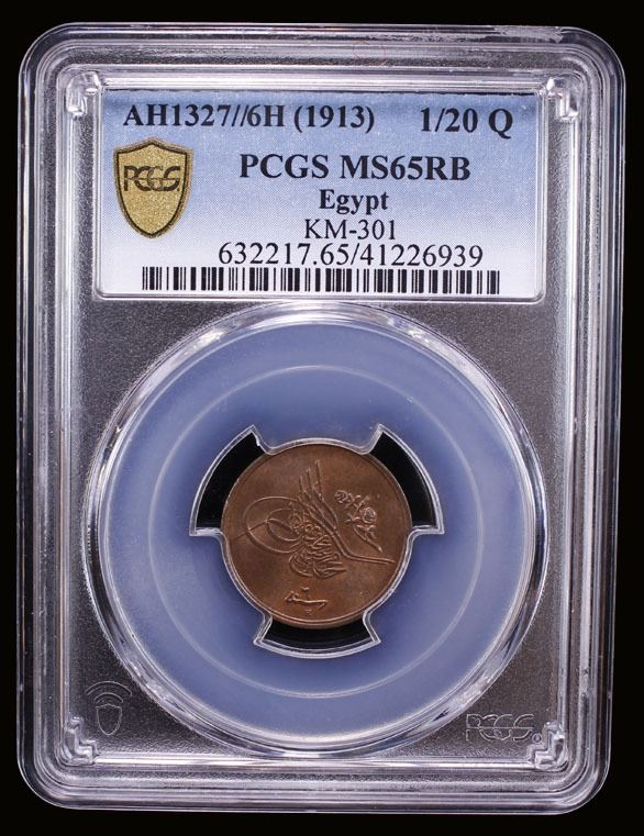 EGYPT: Muhammad V, 1909-1914, AE 1/20 qirsh, Misr, AH1327 year 6-H, KM-301, mostly red, NGC graded MS65 RB, ex Heritage Auction 61371 Lot 25076, ex The 1914 Collection. Finest graded by both NGC and PCGS.