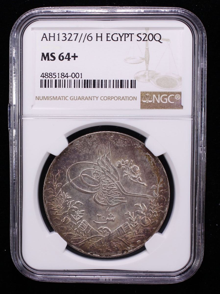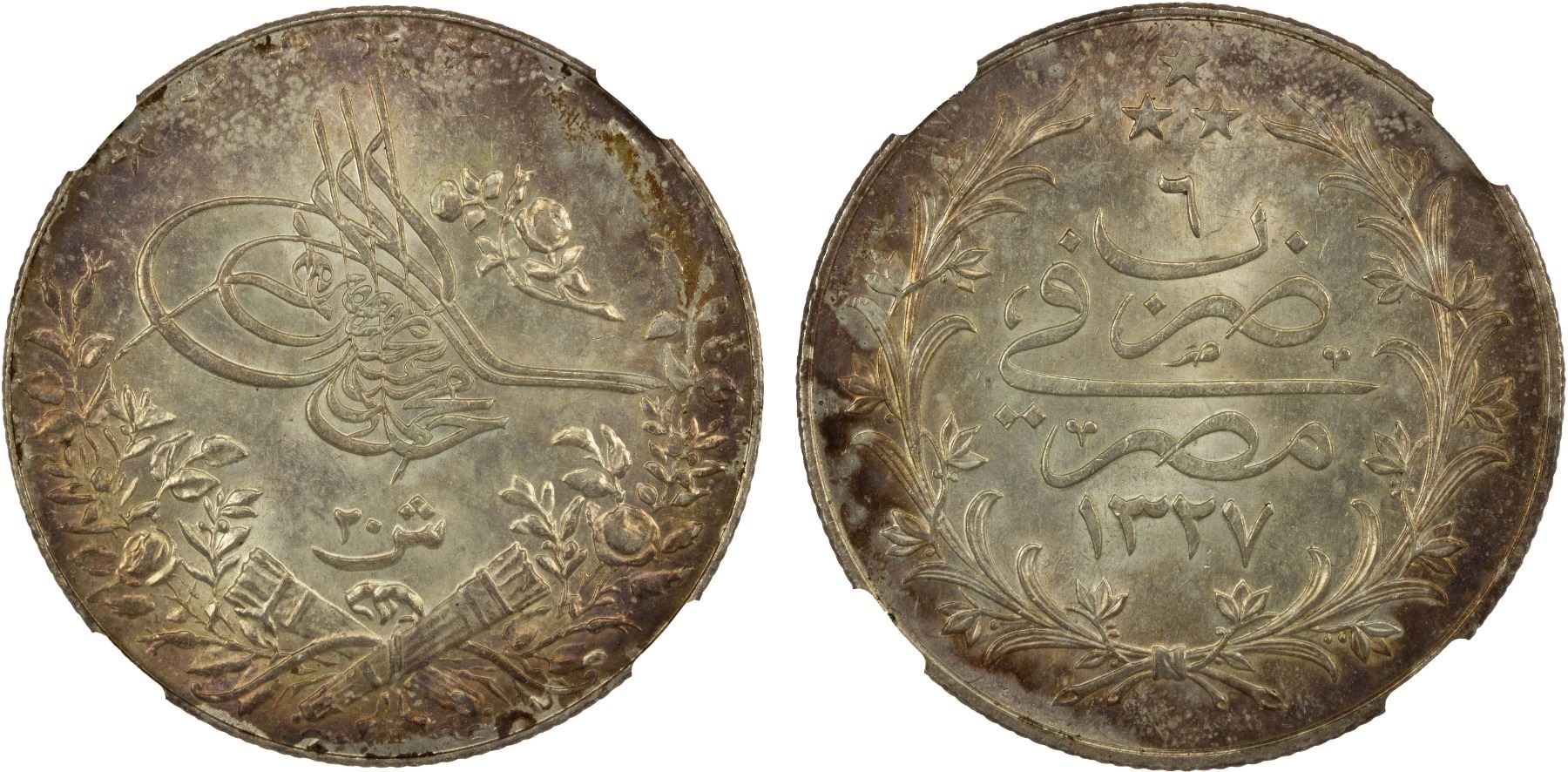 EGYPT: Muhammad V, 1909-1914, AR 20 qirsh, Misr, AH1327 year 6-H, KM-310, Schön-23, fantastic russet peripheral tone, lustrous with nice surfaces, NGC graded MS64+, ex Heritage Auction 3098 Lot 34000, ex The 1914 Collection. Second finest graded by both NGC and PCGS.