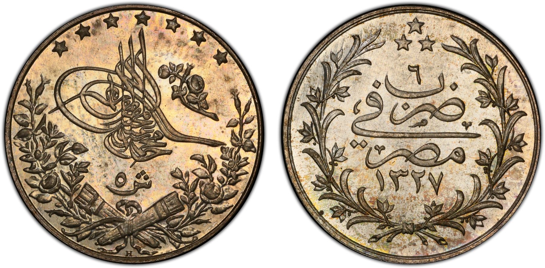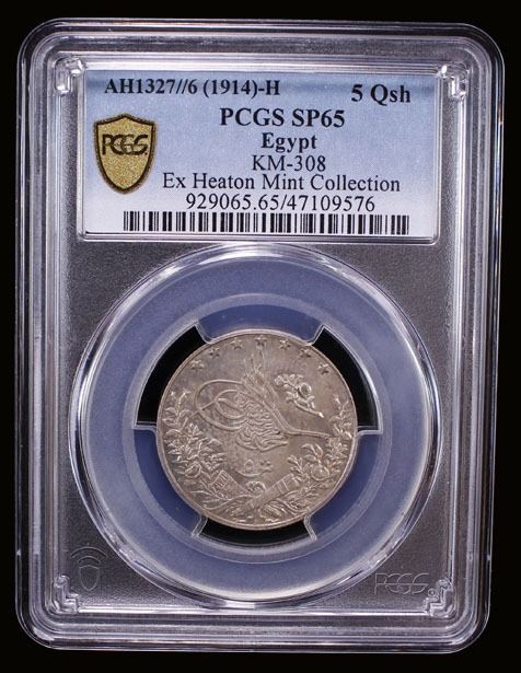 EGYPT: Muhammad V, 1909-1914, AR 5 qirsh, Misr, AH1327 year 6-H, Y-31, KM-308., struck at the Heaton Mint, Birmingham, a superb specimen quality with prooflike luster, very rare, PCGS graded Specimen 65, ex SARC Auction 48, Lot 422; ex Heaton Mint Collection, ex The 1914 Collection. Finest (and only specimen) graded at both PCGS and NGC.