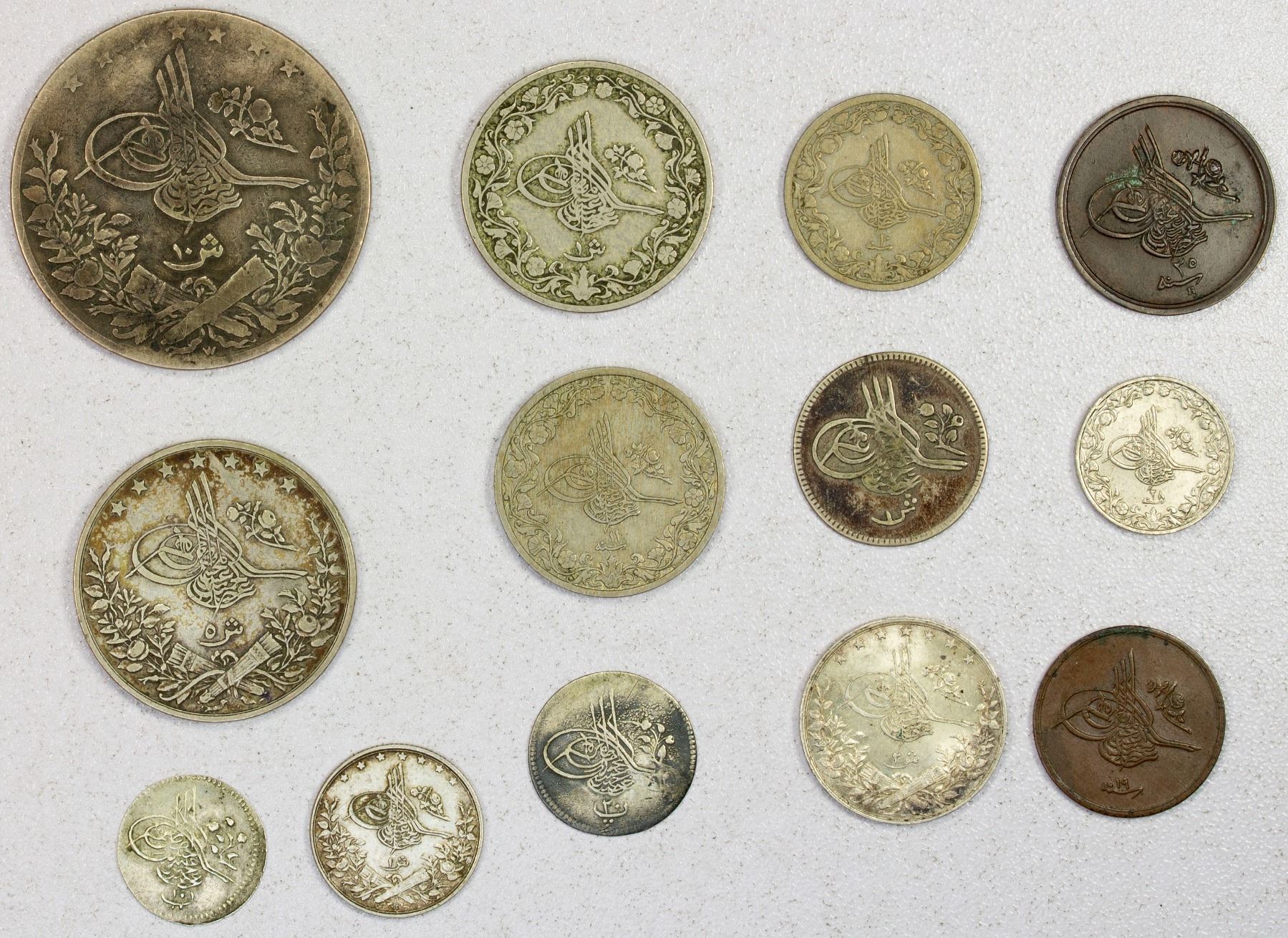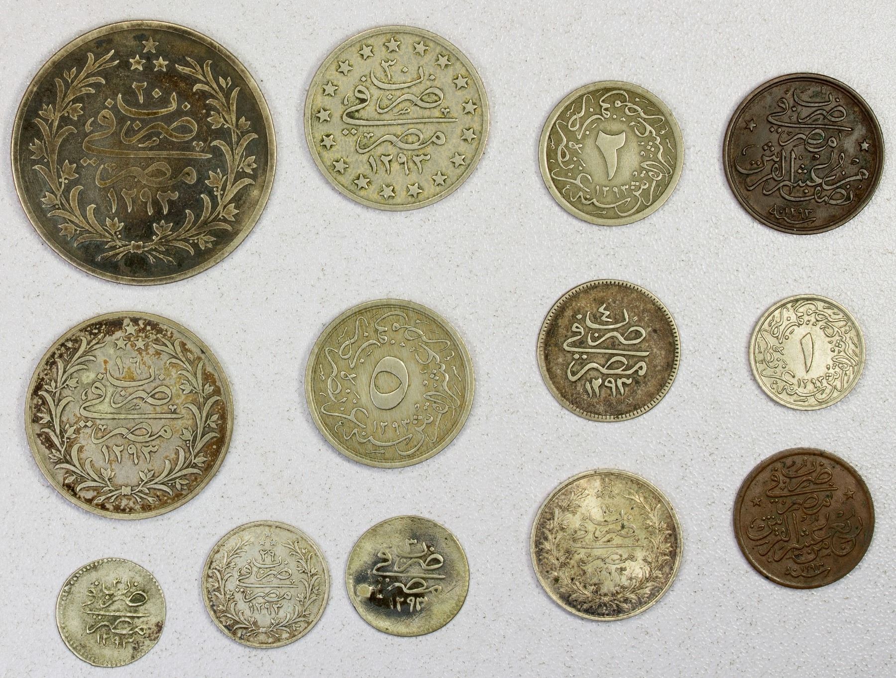 EGYPT: Abdul Hamid II, 1876-1909, LOT or 7 silver and 6 base metal coins, iincluding the three early pre-reform small silver denomination: 10 para: KM-275 year 3 (EF), 20 para: KM-276 year 3 (VF, pierced & plugged), and qirsh: KM-277 year 4 (AVF), and various common issues of the reform series, average circulating grades; retail value $250, lot of 13 pieces.