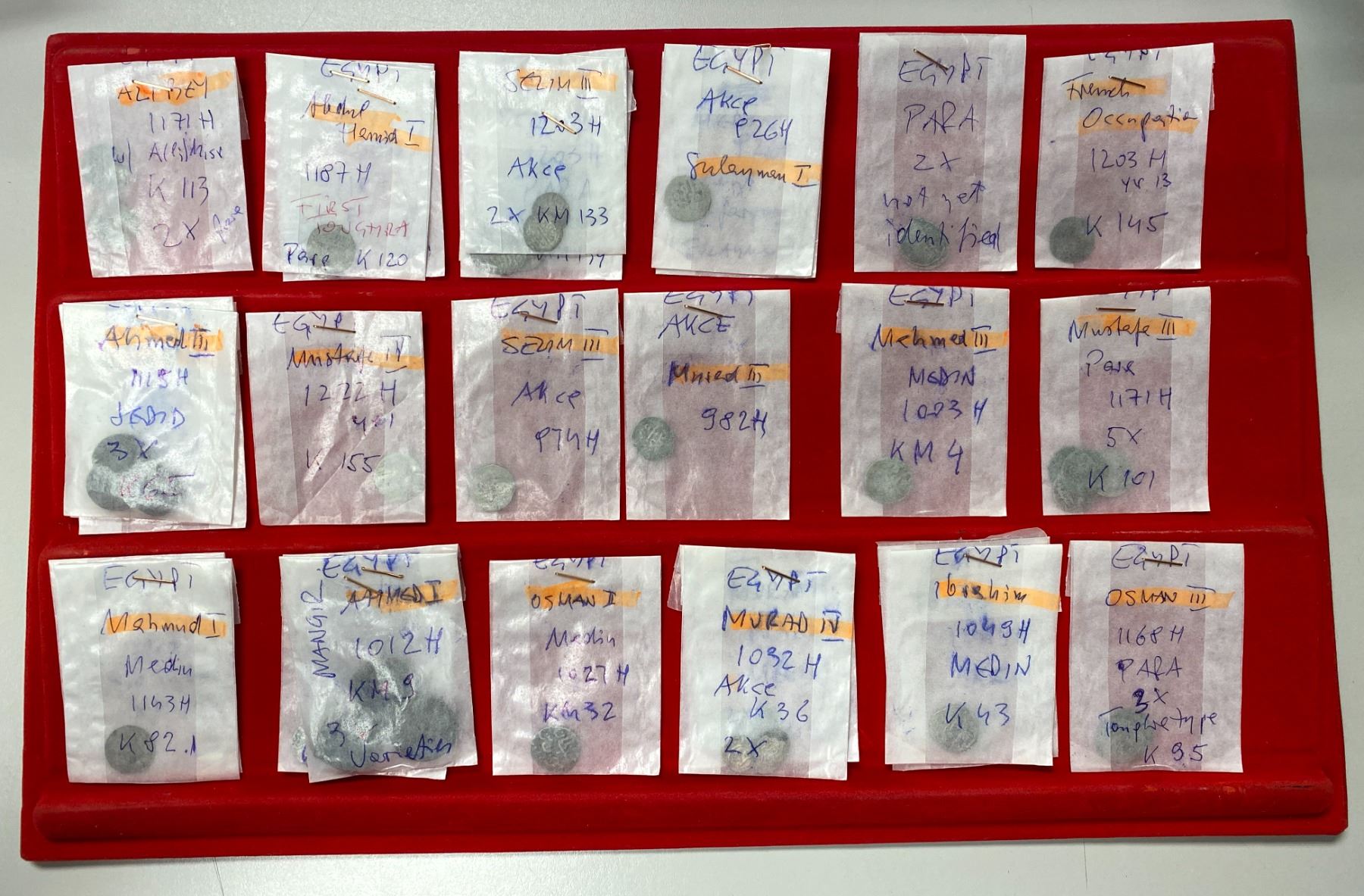 EGYPT: LOT of silver, billon, and copper coins before 1808, including Suleyman I: akçe (1 pc) and medin (1); Selim II: akçe (1); Murad III: akçe (1); Mehmet III: medin (1); Ahmed I: AE mangir (3) and medin (3); Osman II: medin (1); Murad IV: akçe (2) and medin (2); Ibrahim: akçe (1) and medin (1); Ahmed III: AE jedid (3) and para (2); Mahmud I: medin (2); Osman III: para (3); Mustafa III: para (5); Ali Bey: para (2); Abdul Hamid I: para (7); Selim III: akçe (2), para (4), and piastre (1); French Occupation: para (1, pierced); Mustafa IV: para (1); and unidentified: para (2); all in the consignor's stapled glassine envelopes (not checked for attribution, qualtity, or grade); probably mst in below average grades; retail value should be at least $500, lot of 53 pieces. Consignor's KM number attribution also included.