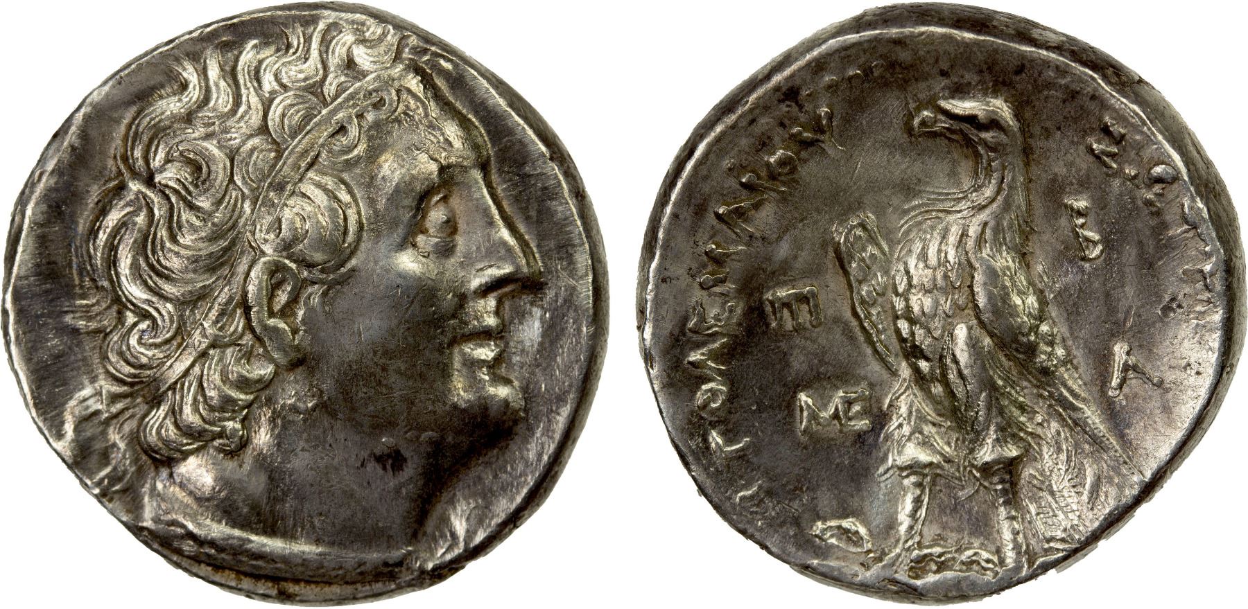 EGYPT (PTOLEMAIC): Ptolemy III Euergetes, 246-222 BC, AR tetradrachm (14.16g), Ptolemaïs-Ake, year 2 (245 BC), Svoronos-1035, CPE-857, diademed head of Ptolemy I right, wearing aegis around neck // eagle with closed wings standing left on thunderbolt, monogram above ME monogram to left, B (date) above A to right, moderately cleaned, Choice VF.