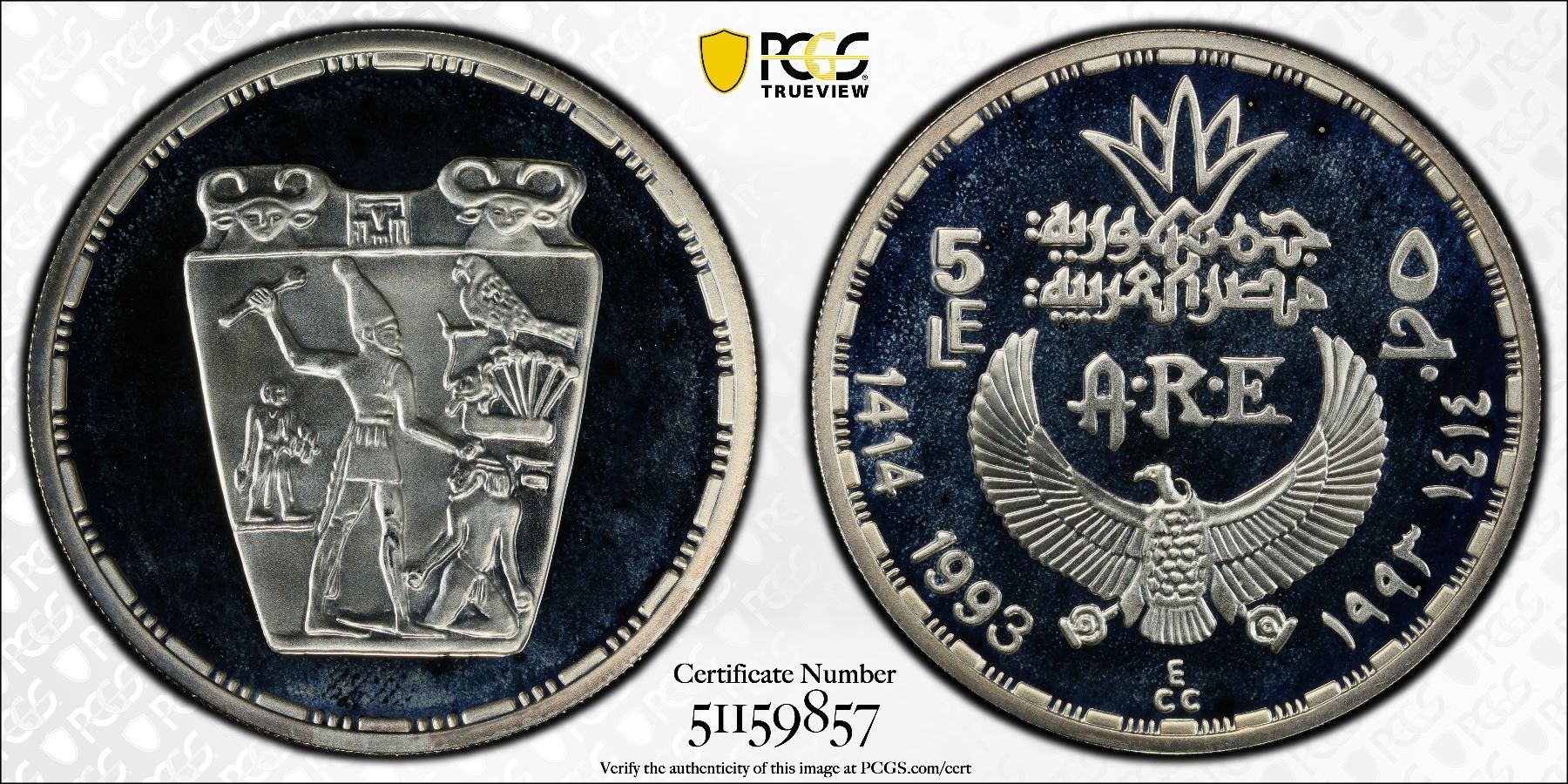 EGYPT: Republic, AR 5 pounds, 1993/AH1414, KM-742, Ancient Treasure – King Narmur, a spectacular example, PCGS graded PF68 Deep Cameo.